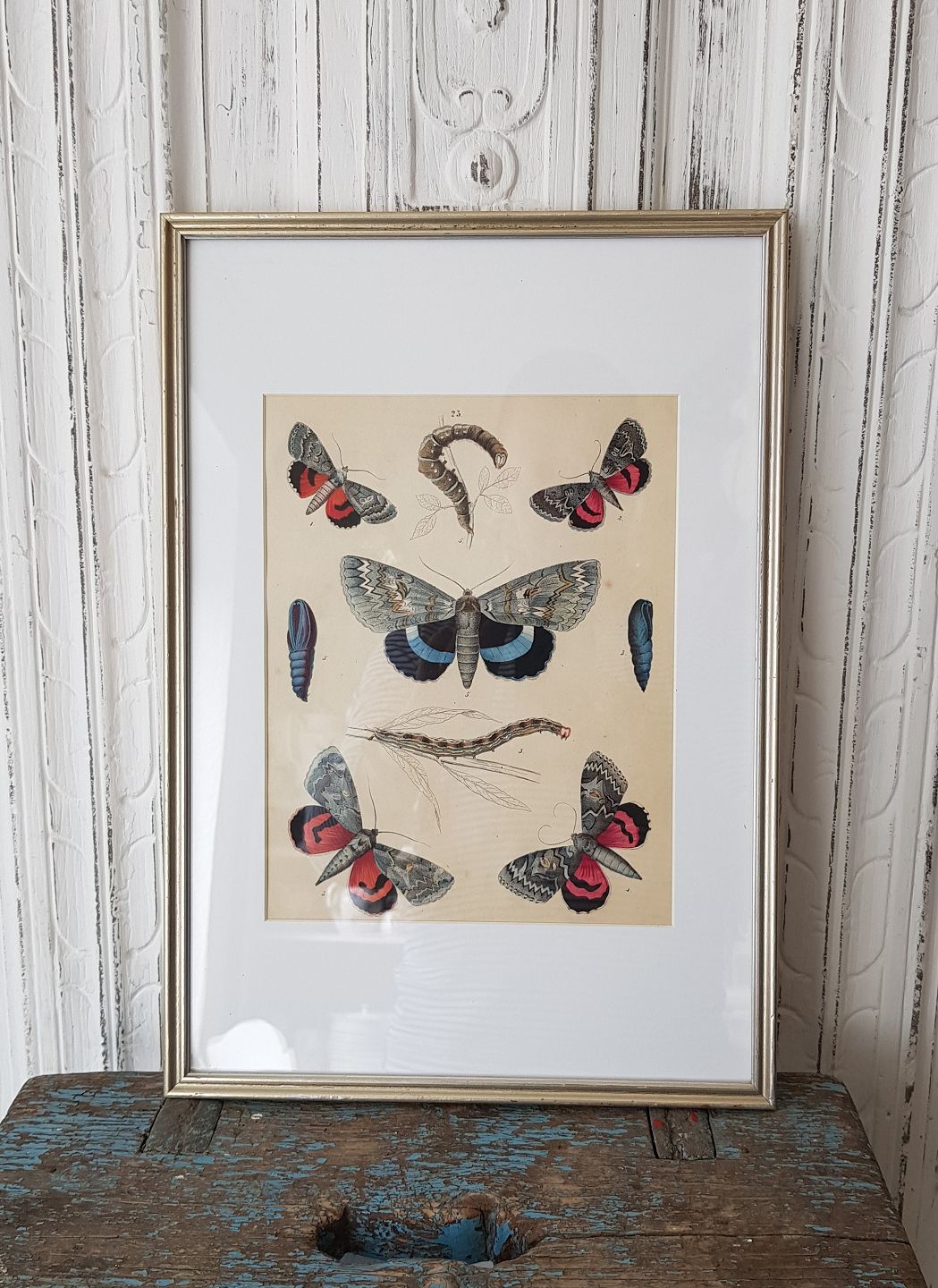 1800tals håndkoloreret tryk med sommerfugle i smuk enkel sølvramme.