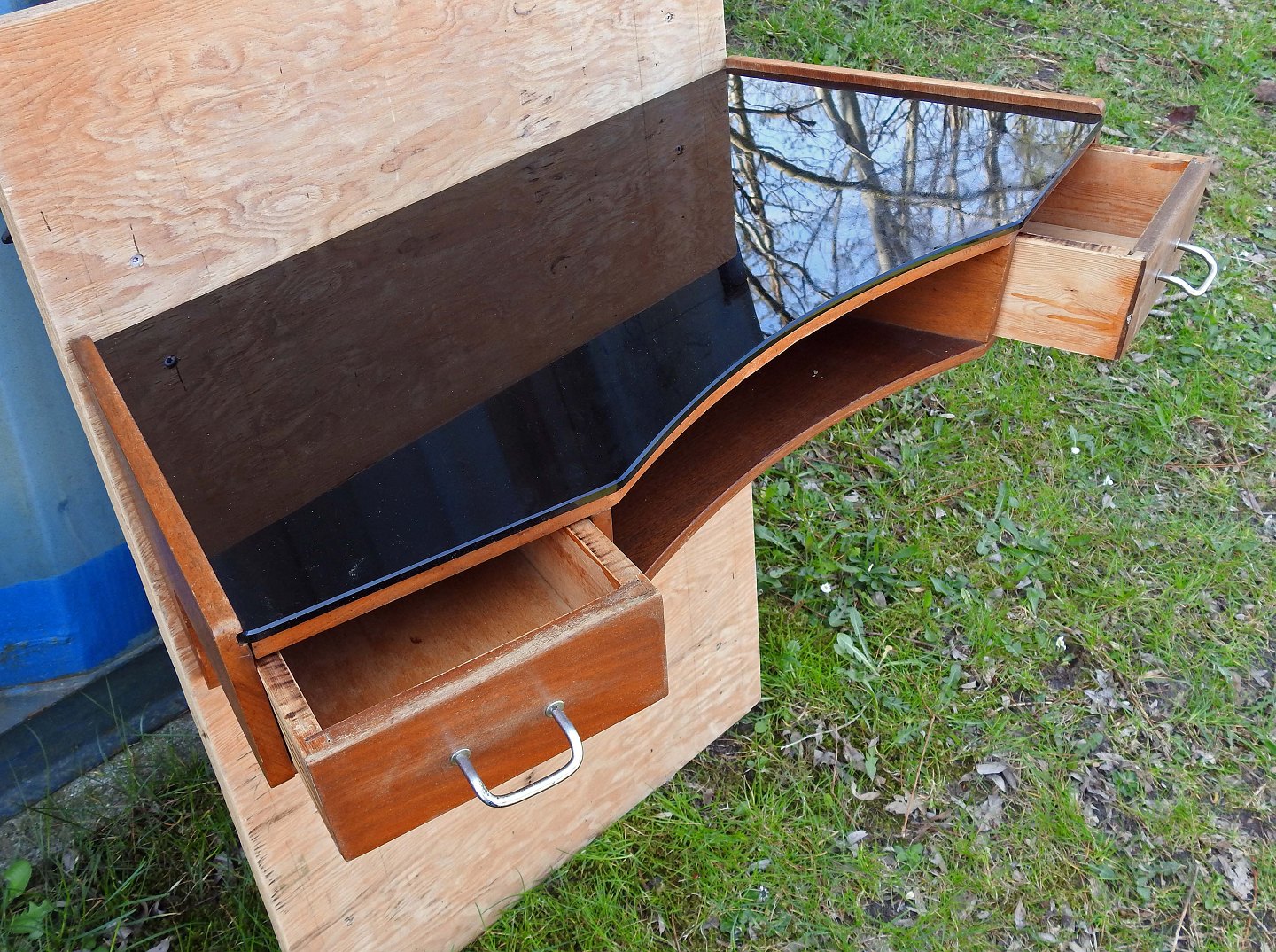 Væghængt frisørbord i teaktræ med sort glas plade og to skuffer og hylde. Dansk design.