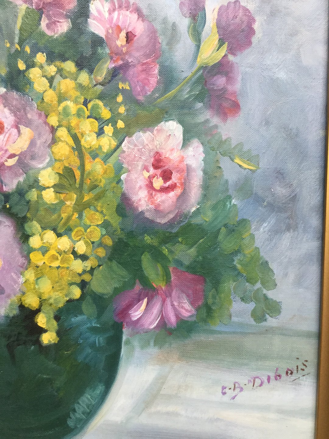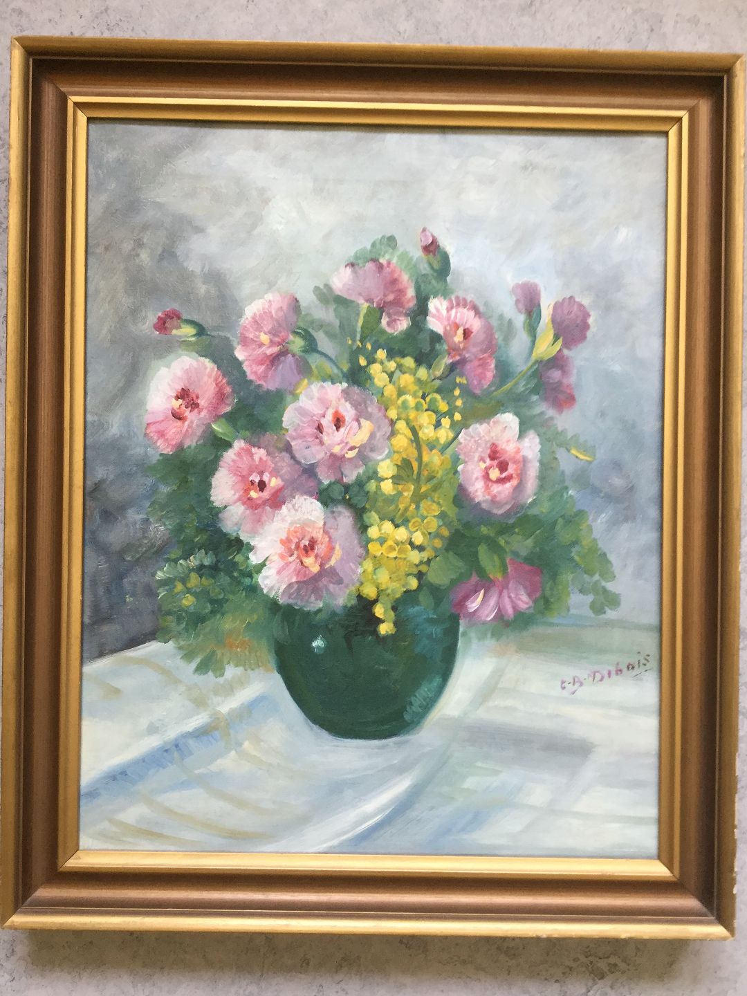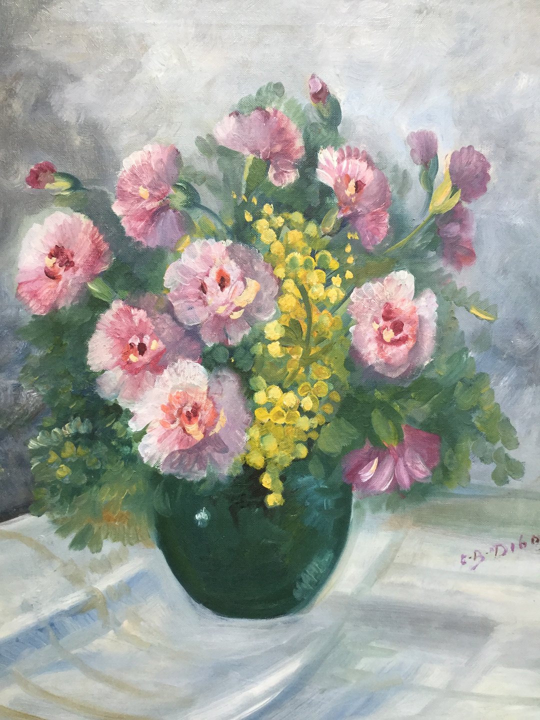 Maleri af Ingeborg Debois - Vase med lyserøde nelliker og mimoser.