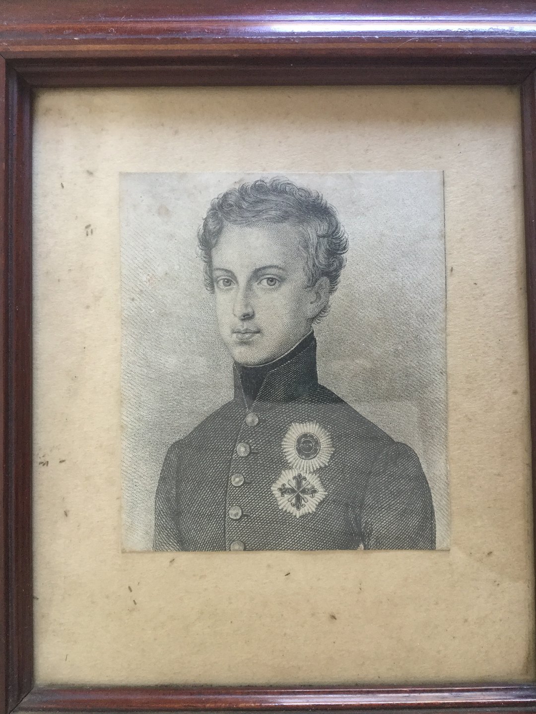 Indrammet i smuk mahogni ramme (18x16).
