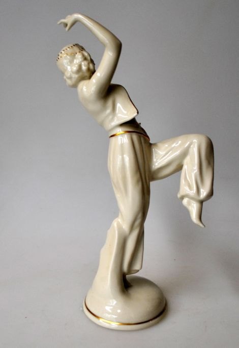 Figur, orientalsk danser, Schaubach, 20. årh. Tyskland. Creme farvet med forgyldning. Stemplet. H.: 23 cm.