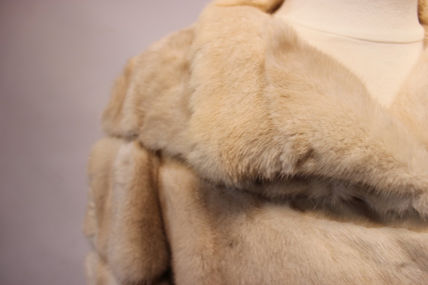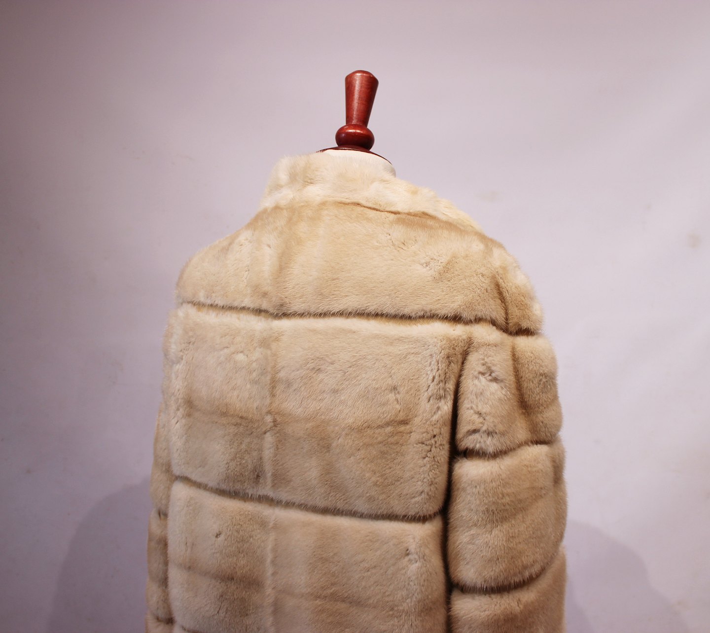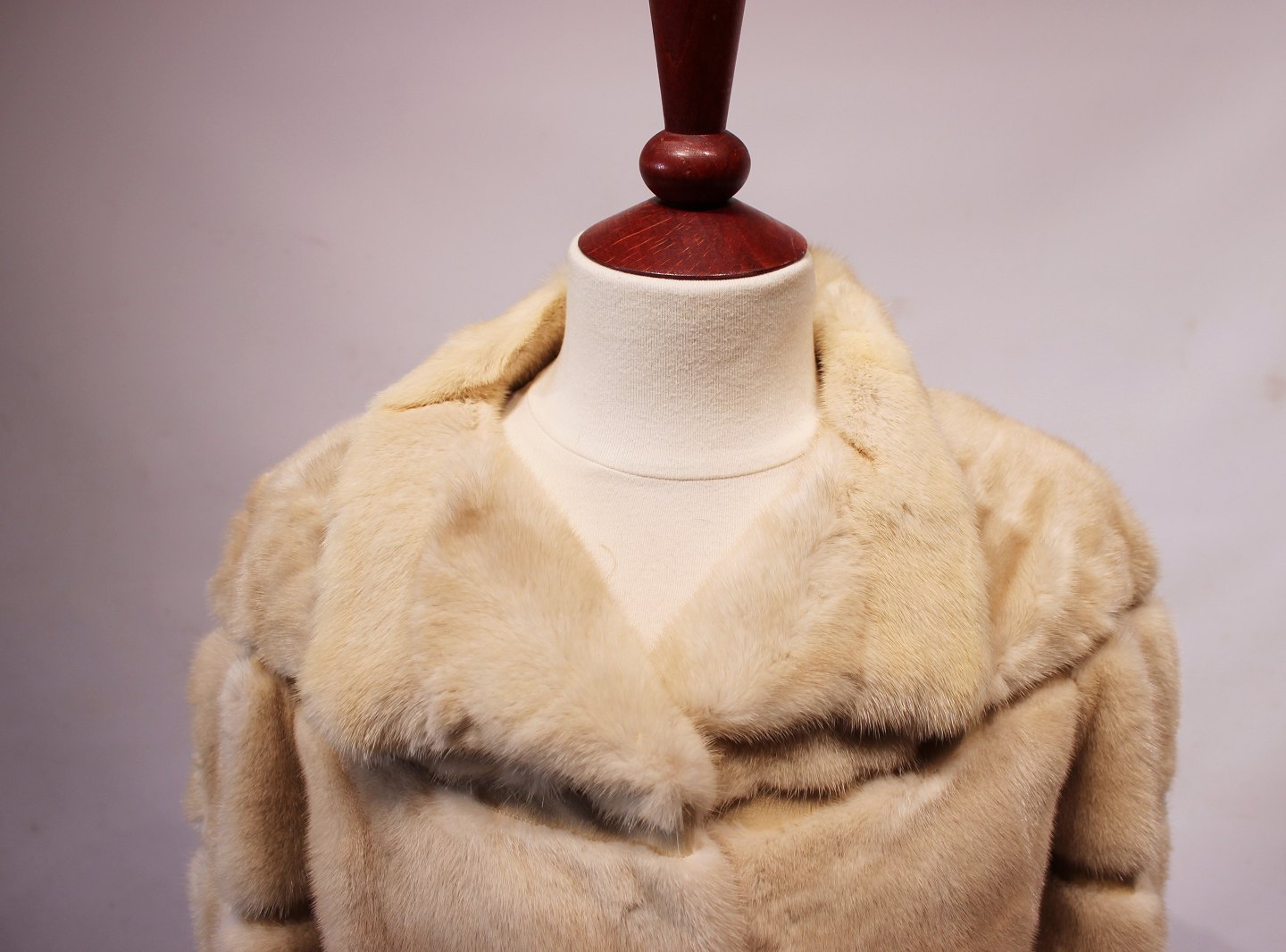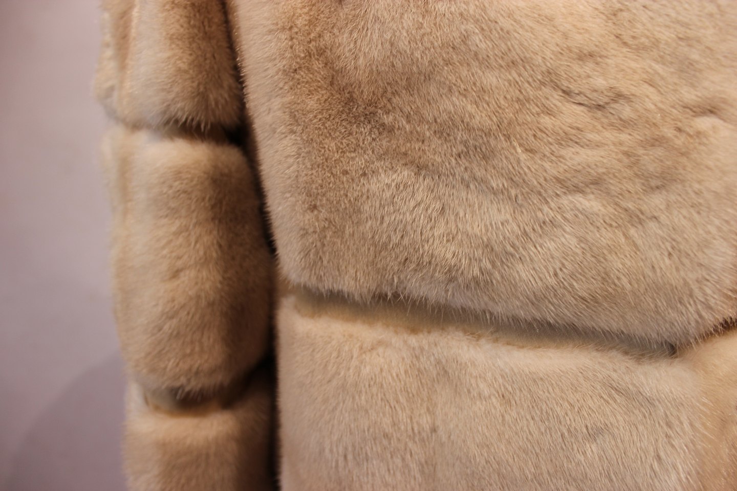 Lang pels frakke af lys mink fra Brdr. Axel Petersen. Frakken er i rigtig flot stand, og kan kortes af både i længden og ærmerne, så man i alt har tre muligheder. Er købt for 80.000 kr. fra cirka 15 år siden.