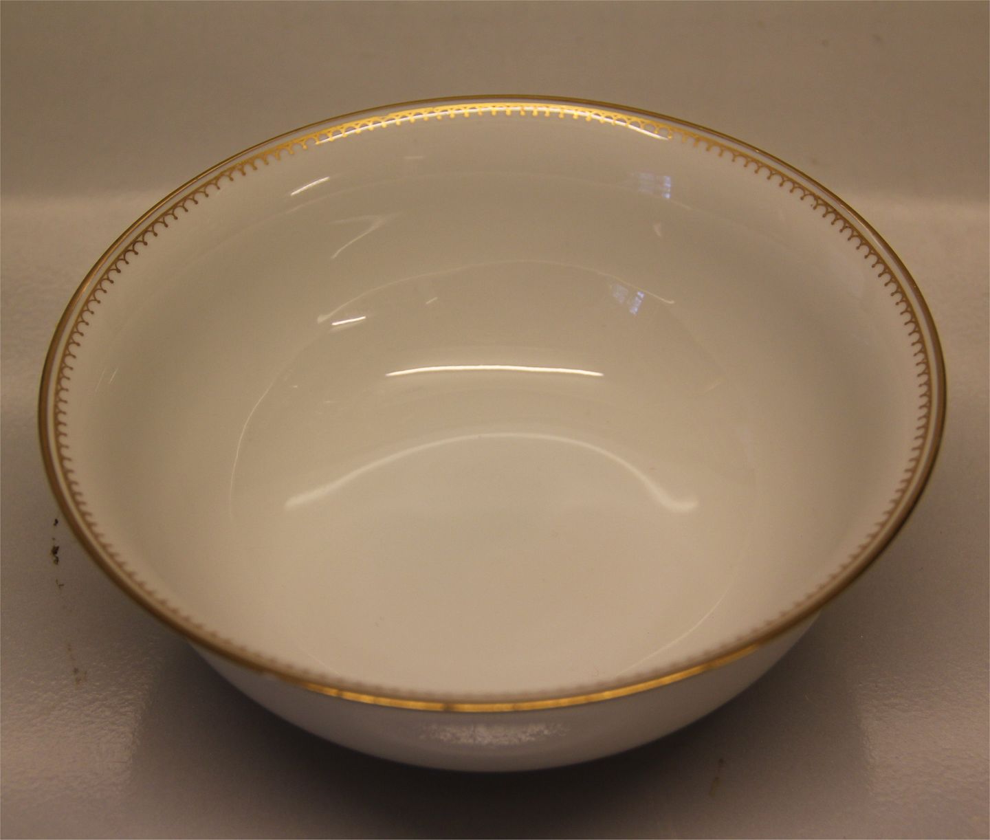 044 Rund skål 7 x 18 cm (312) B&G Menuet: Hvidt porcelæn, takket guldkant, hvid, form 601 Bing & Grøndahl