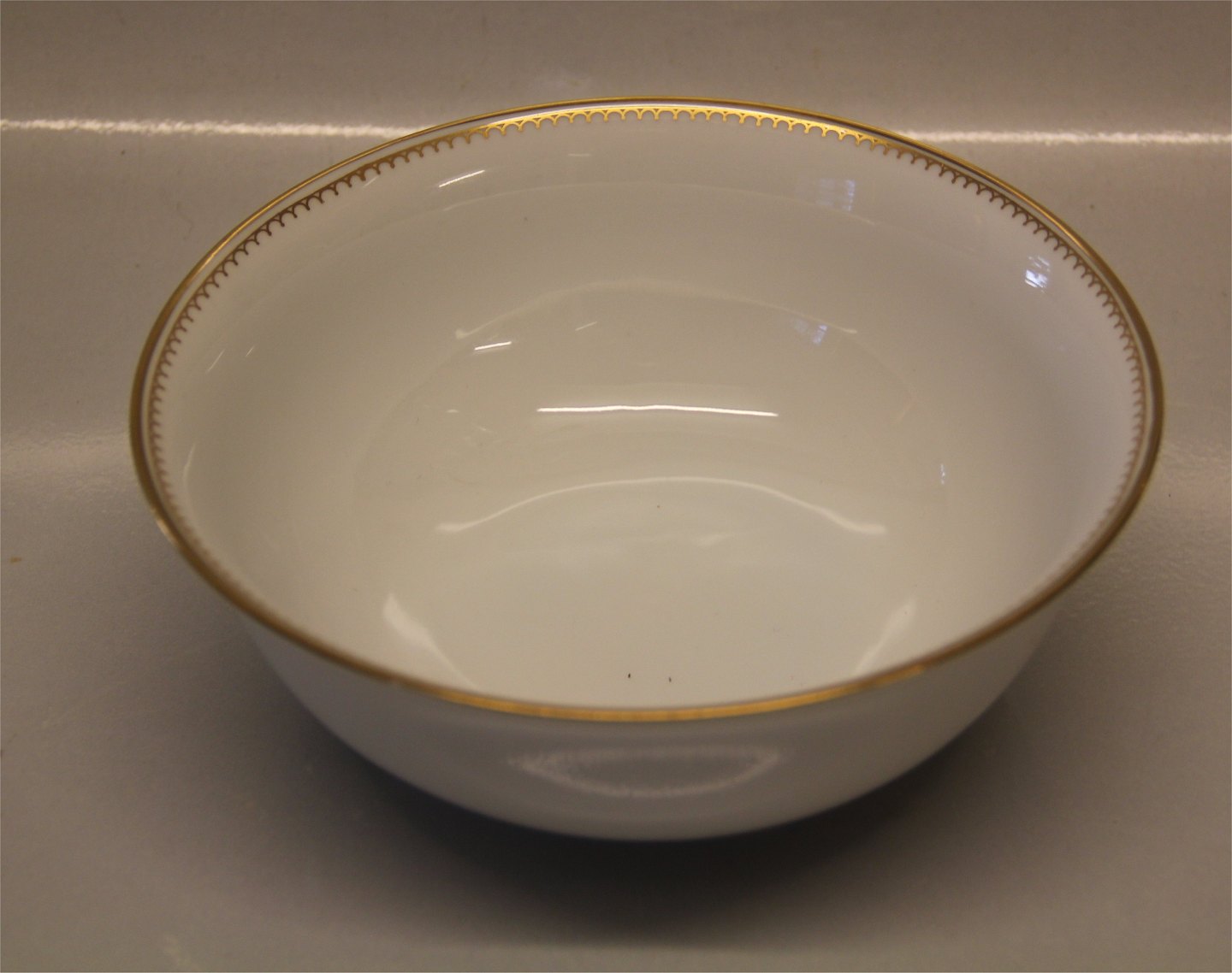 044 Rund skål 7 x 18 cm (312) B&G Menuet: Hvidt porcelæn, takket guldkant, hvid, form 601