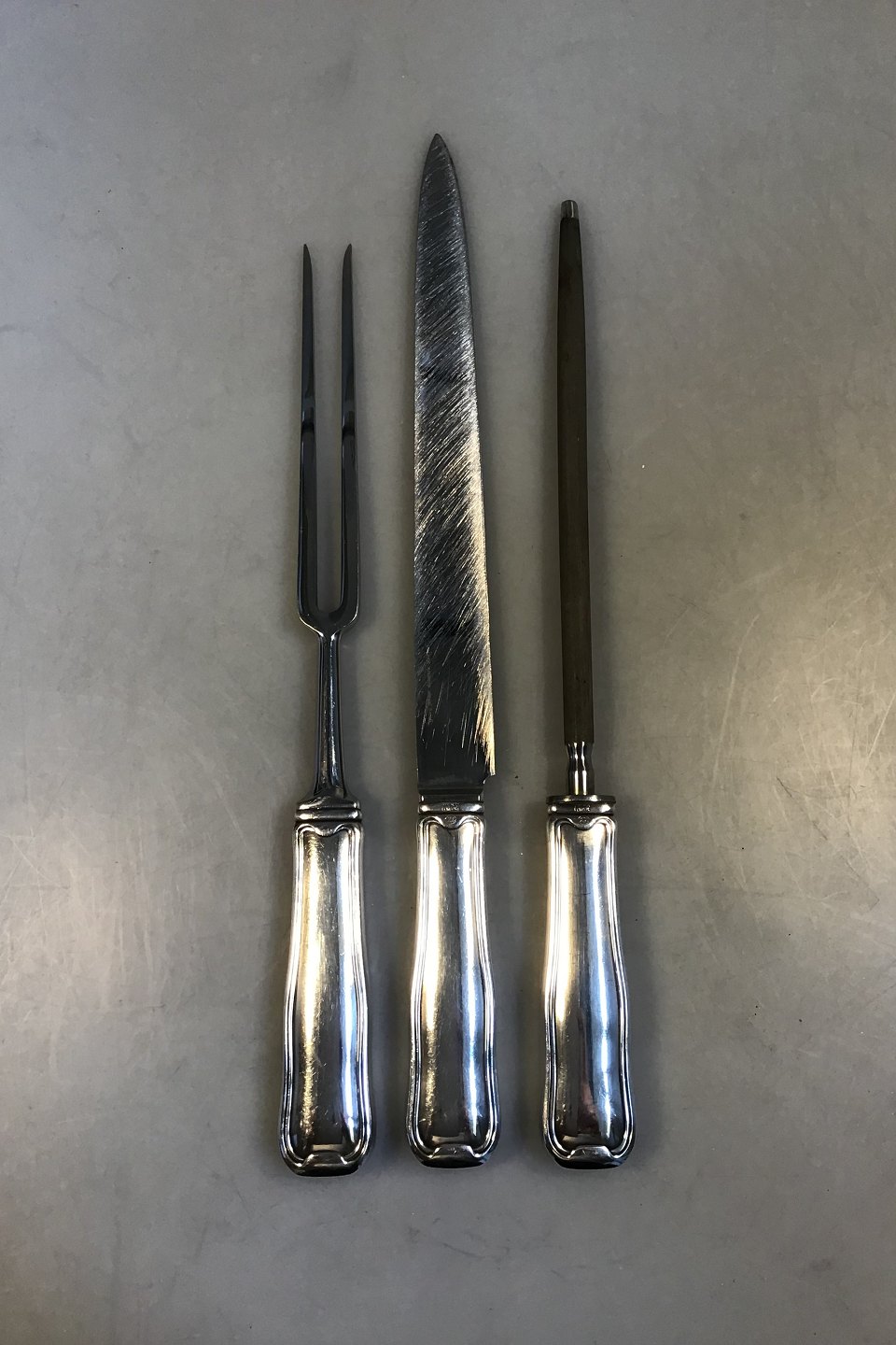 Georg Jensen Sterling Sølv og Rustfrit Stål Dobbeltriflet Forskærersæt No 119/120. Måler Kniv: 33,3 cm, Gaffel: 29,8 cm Strygestål: 30.5 cm (OBS Knivsblad med mærker efter strygestål)