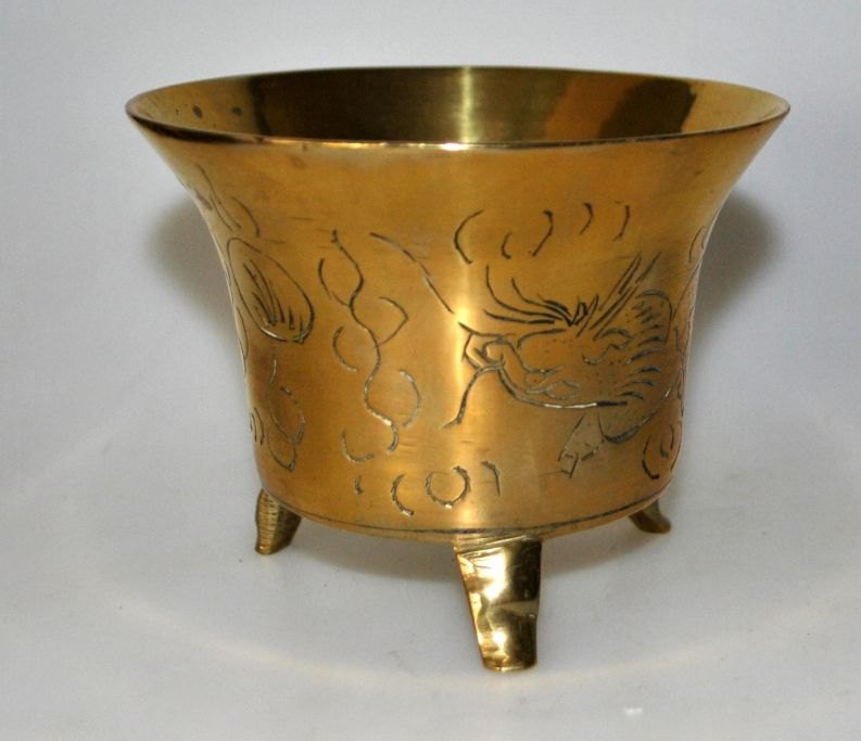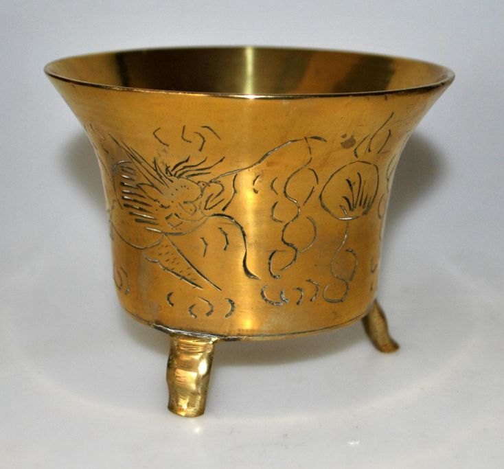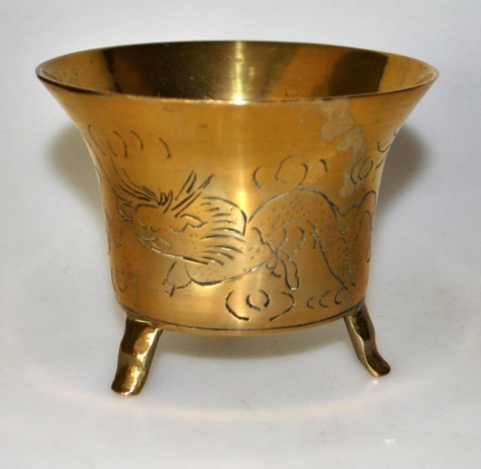 Kinesisk bronze bæger på tre ben, 19./20. Årh. Siden dekoreret med drager. Stemplet: China. H.: 8,5 cm. Dia.: 11 cm.