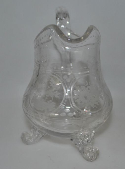 Fløde kande i klart glas, o. 1900, Tyskland. Med slibninger i form af blomster og landskaber. Med snegle hank og ben. H.:12 cm.  Perfekt stand!