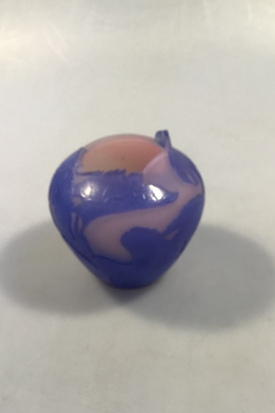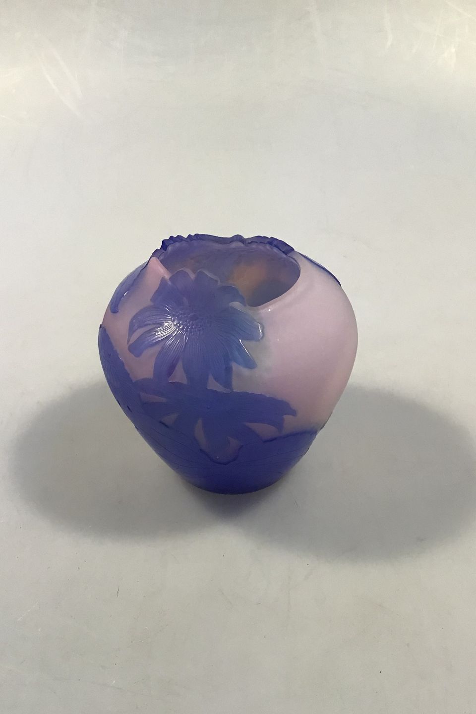 Emile Gallé, Vase rosa matteret glas dekoreret med blå lilla overfang udskæring med blomster og blade H 9 cm
