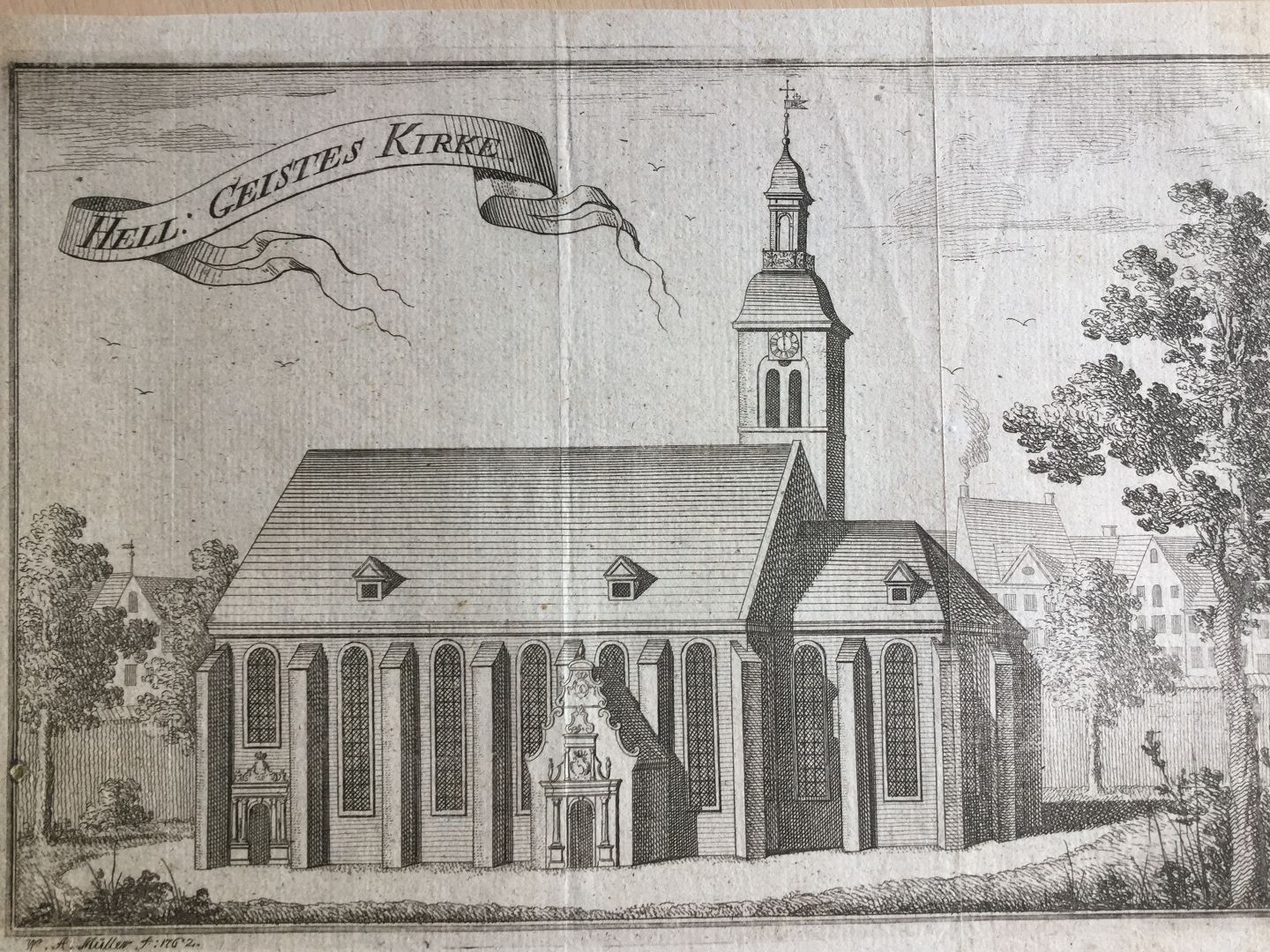 Gammelt kobberstik af W.A. Müller og Erik Pontoppidan - Helligåndskirken i København 1762 - fra Danske Atlas.