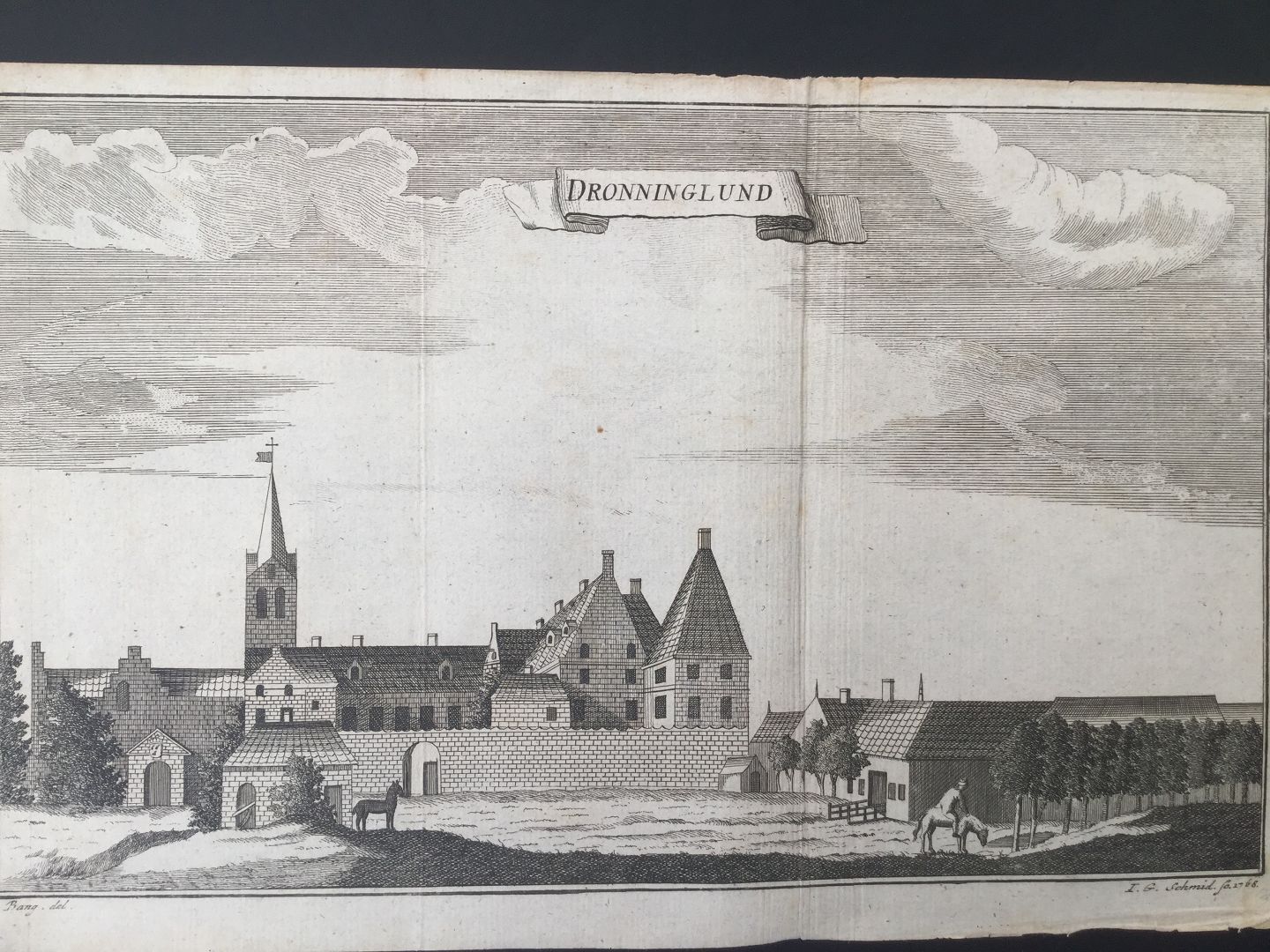 Gammelt kobberstik af Erik Pontoppidan og Johan Georg Schmid - Dronninglund Slot 1768 - fra Danske Atlas.