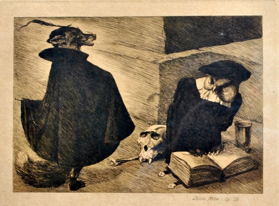 Moe, Louis (1877 - 1945) Danmark: En ræv og en ugle. Radering. Opus 28.