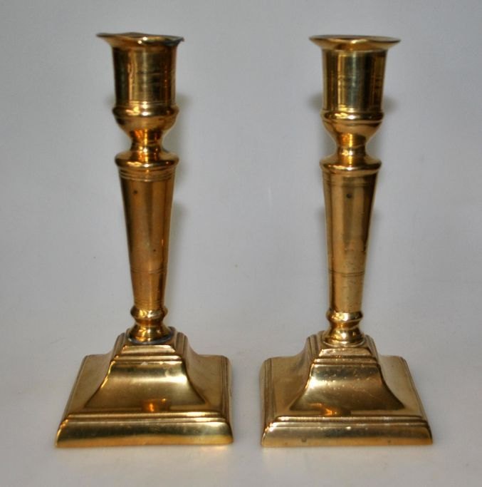 Par danske empire lysestager  messing, 19. årh. På firkantet fod og profileret stamme. Stemplet.: PB. Højde.: 17 cm.
