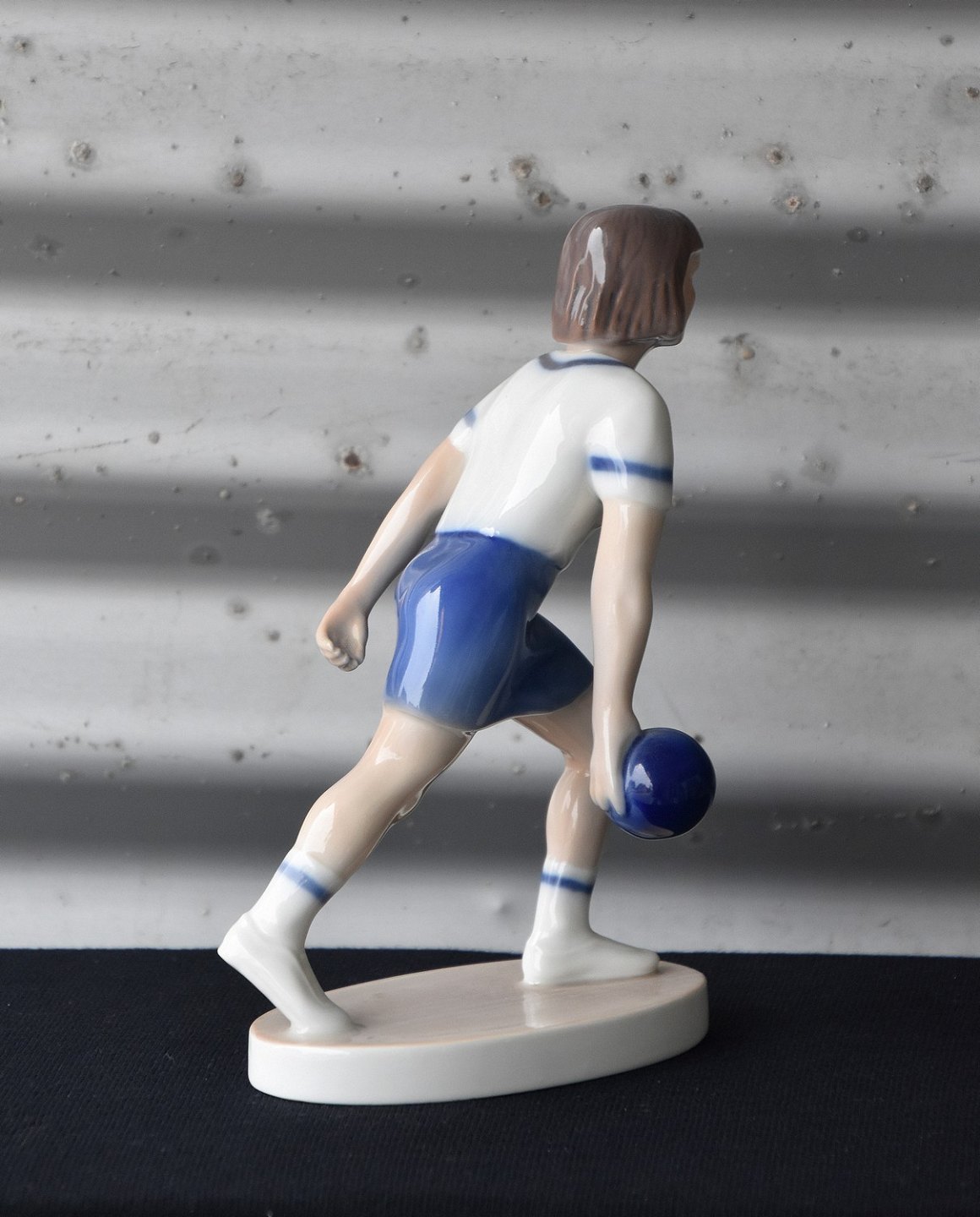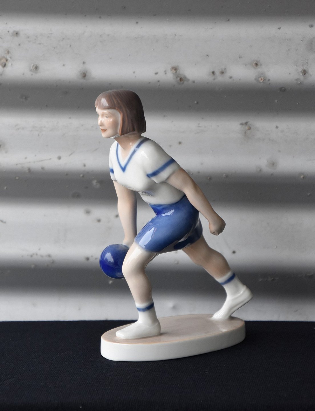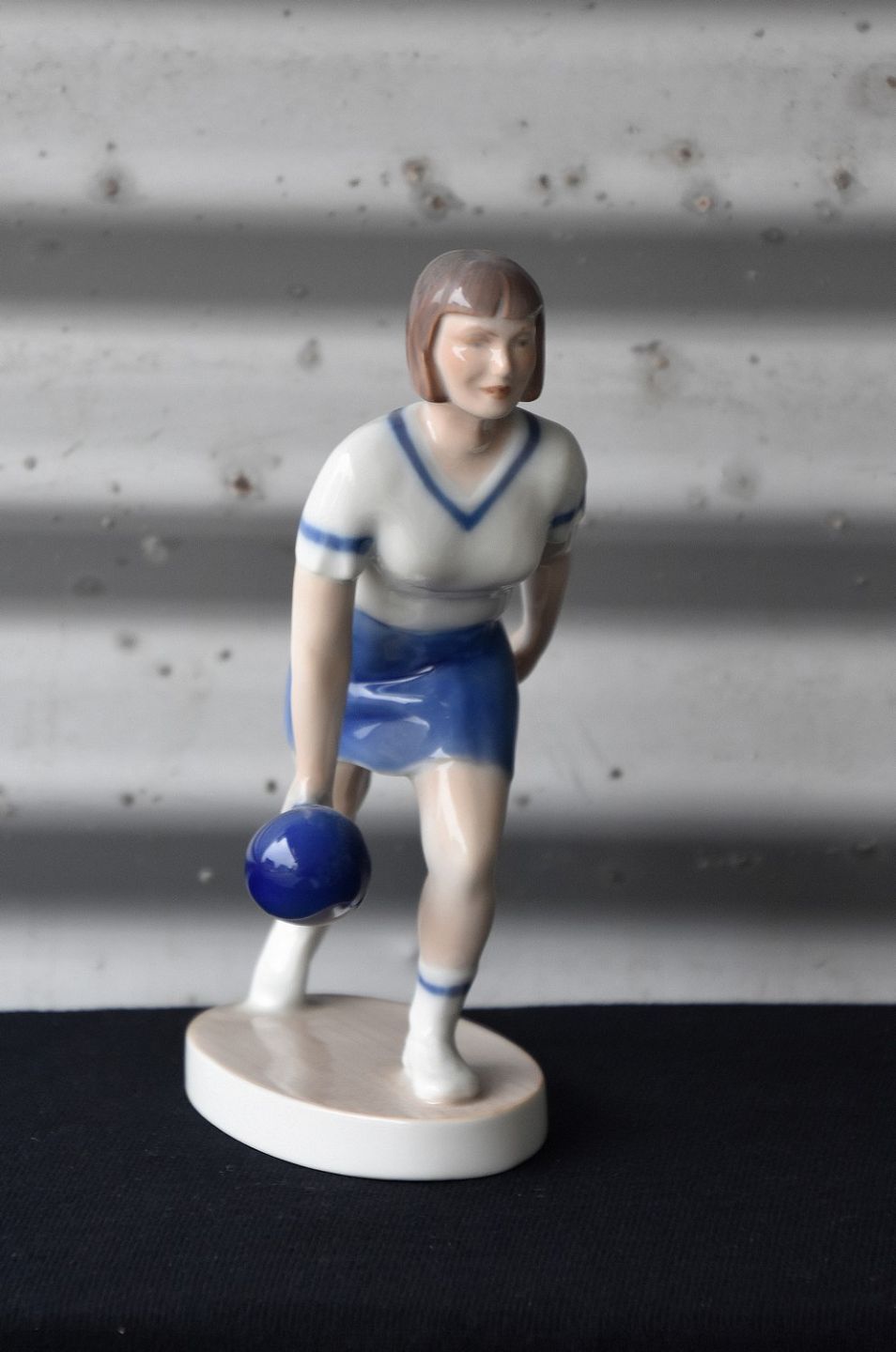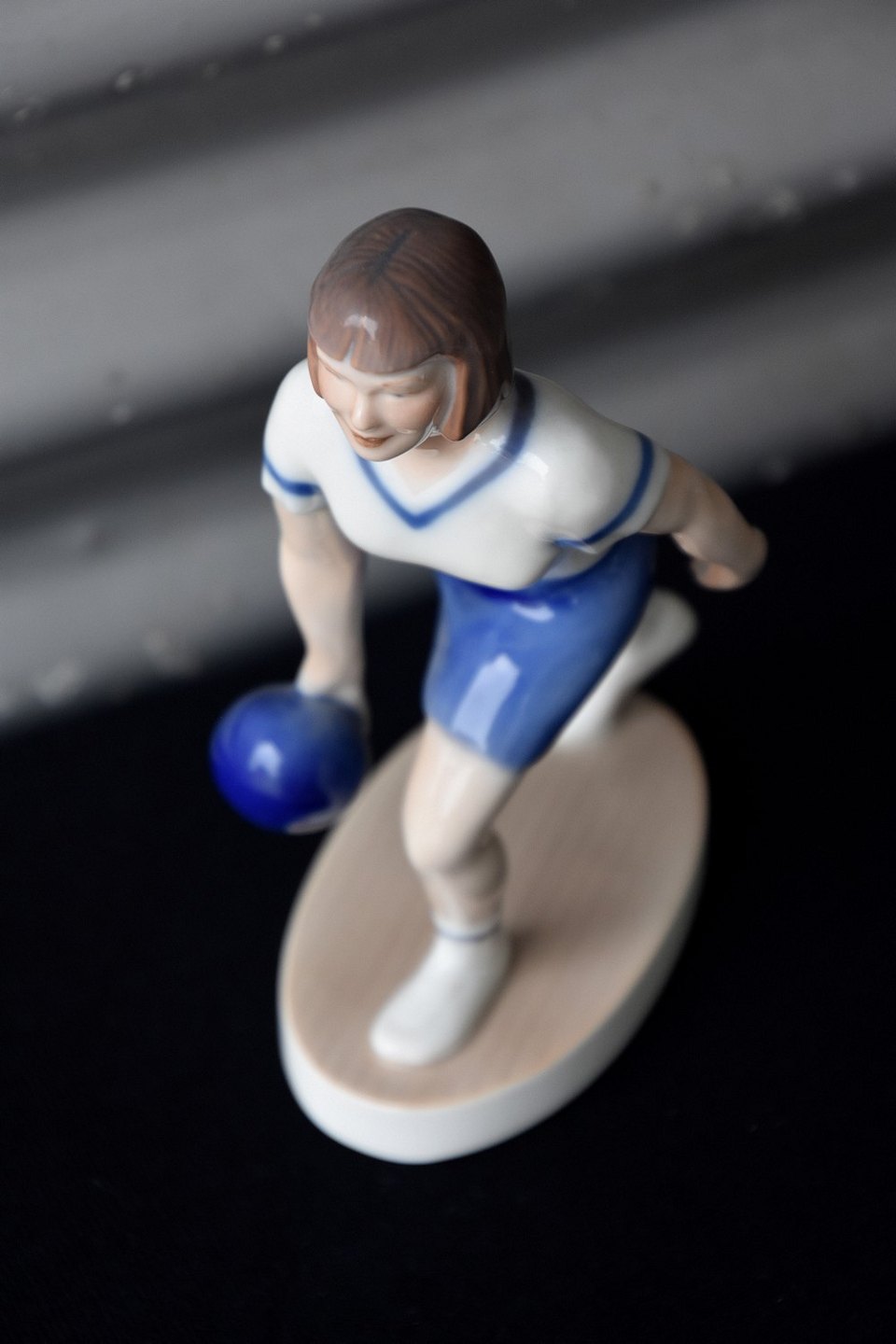 Figur i porcelæn med motiv af kvinde med bowlingkugle. Nr. 2487
