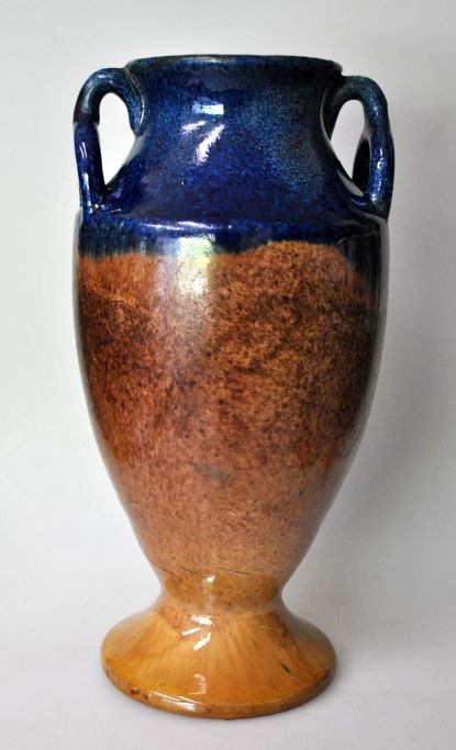 Klassisk Jugend vase, lertøj, 20. årh. Danmark. Med to håndtag. Brun og blå glaseret. Usigneret. H.: 28 cm.