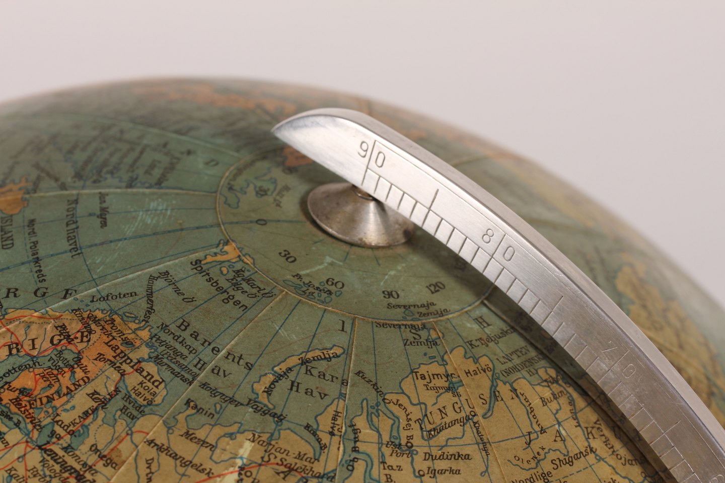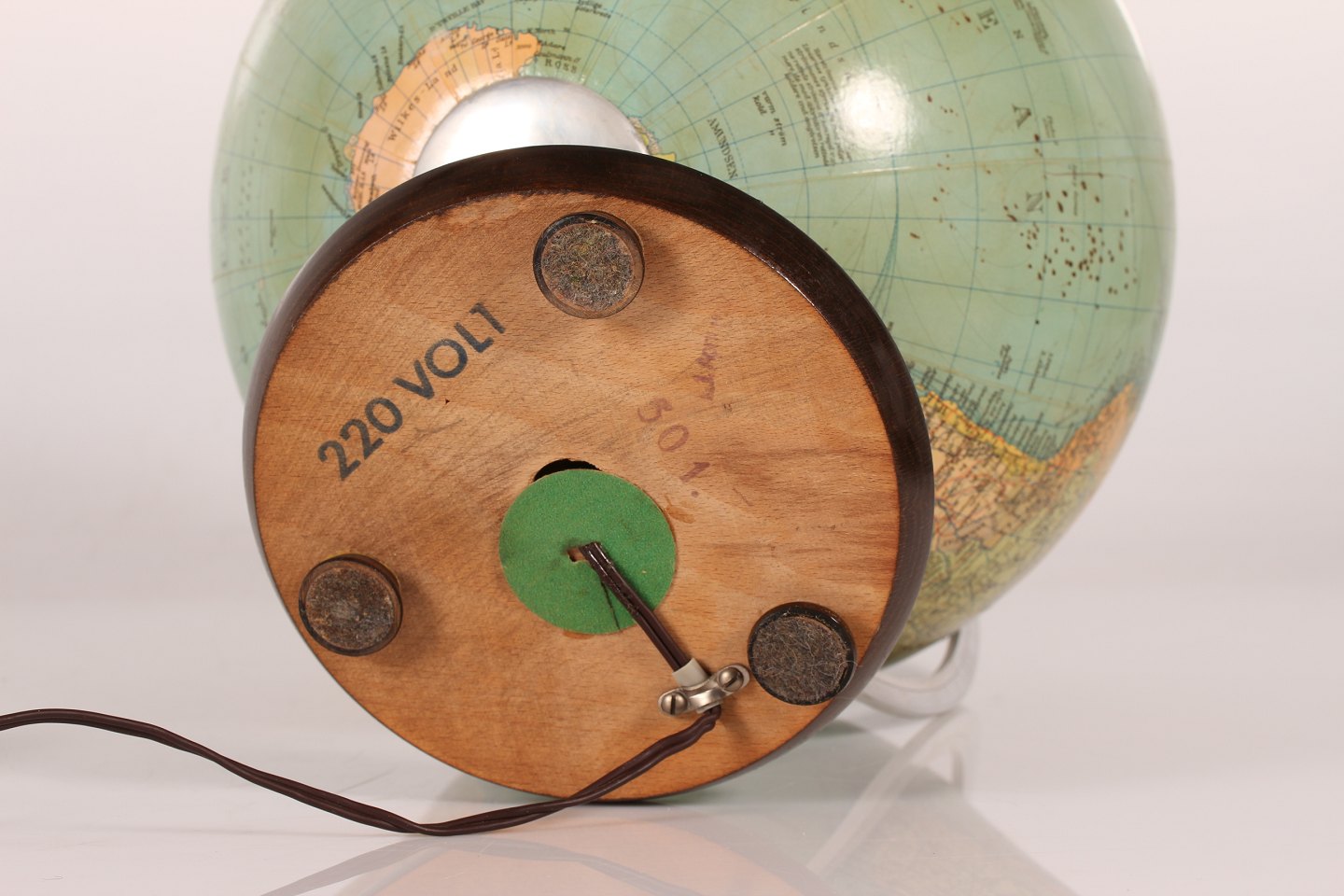 Gammel globus m/indlagt lys og stander af drejet massivt træ