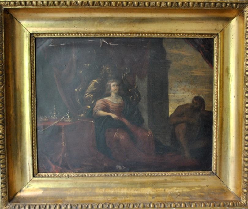 Portrait of a queen sitting on throne next to a table where the regalas are laid out on red tablecloth, oil on copper plate, unsigned. 25 x 32.5 cm.