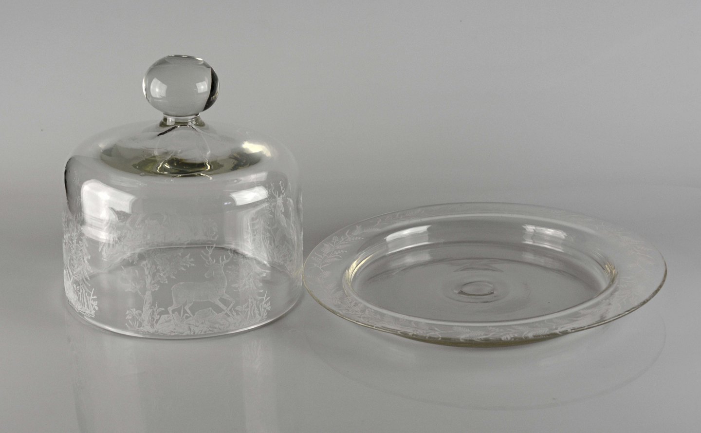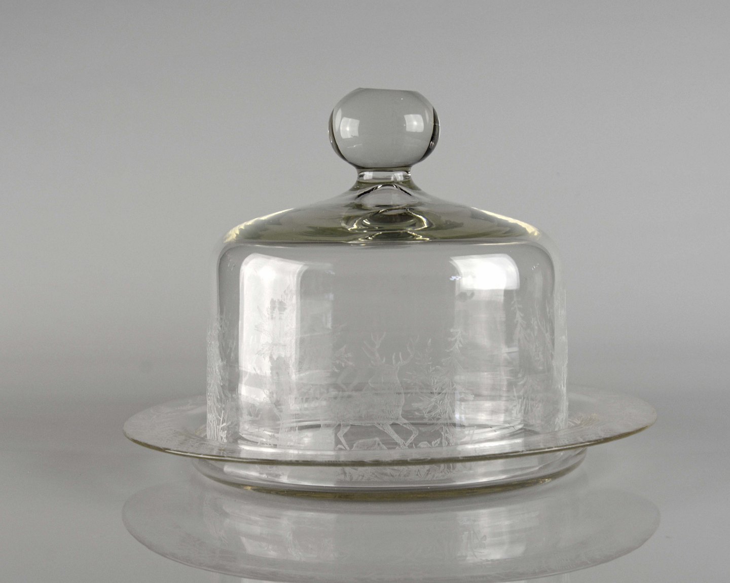 Osteklokke i glas med motiv af rådyr og skov fra Kastrup Glasværk ca. 1910. ætset motiv.