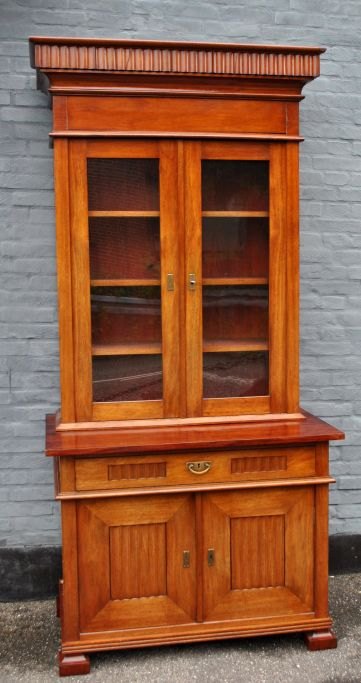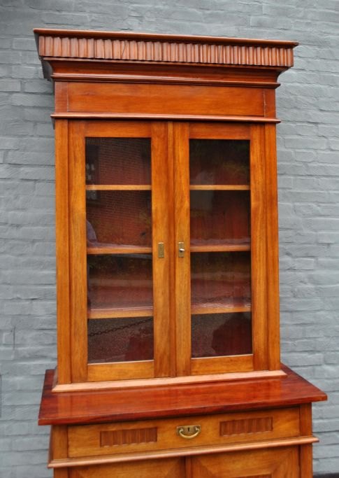 Mahogni bogskab, ca. 1910 - 1920, Danmark. Underskab med to låg og skuffe. Øverst skab med to glaslåger og indvendige hylder. Øverste skab: H.: 145 cm. B.: 100 cm. D. 36 cm. Nederste: B: 109 cm. D. 61 cm.  Højde: 85 cm.