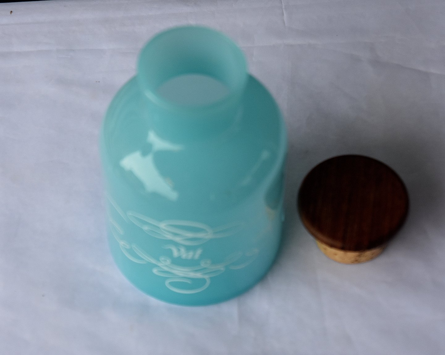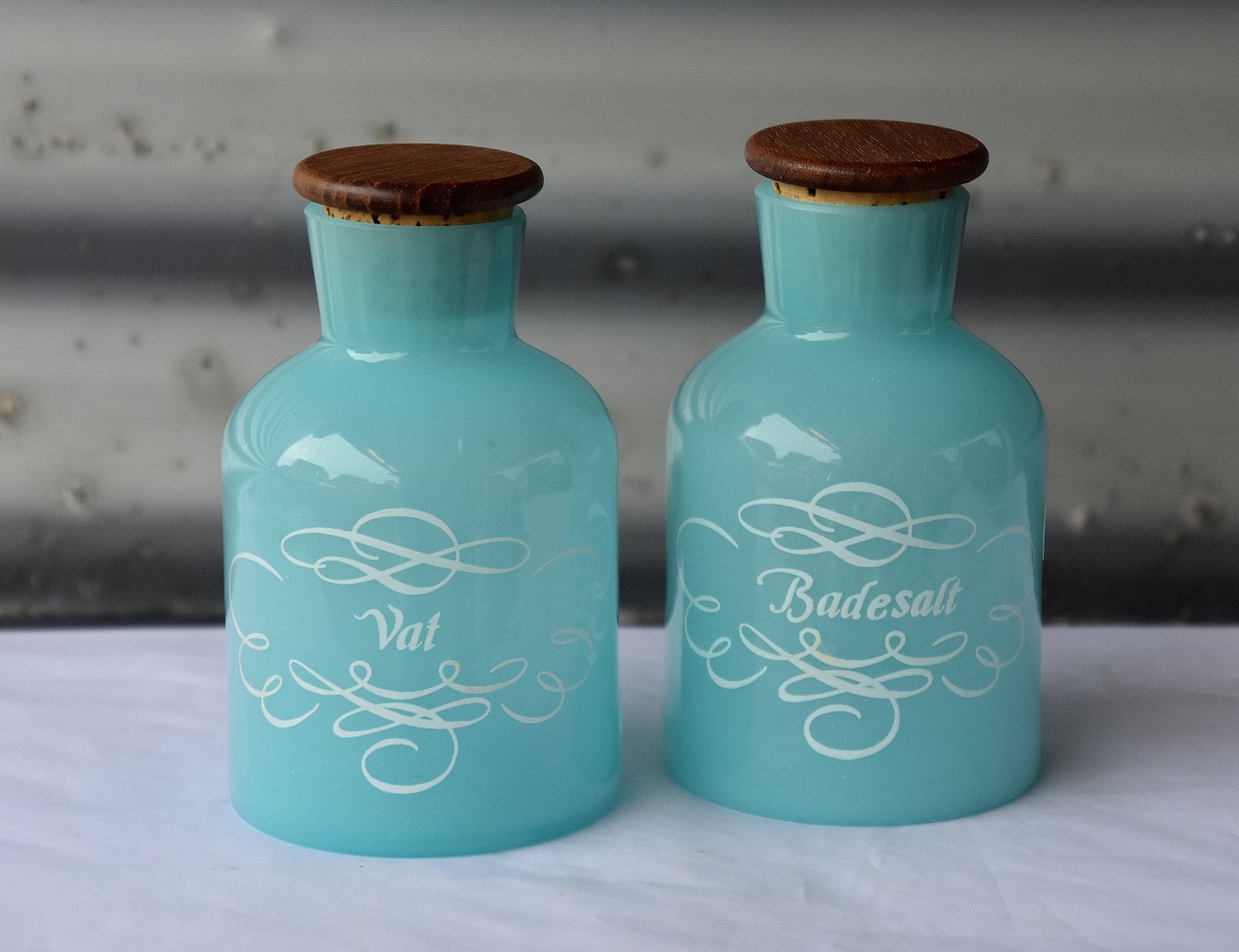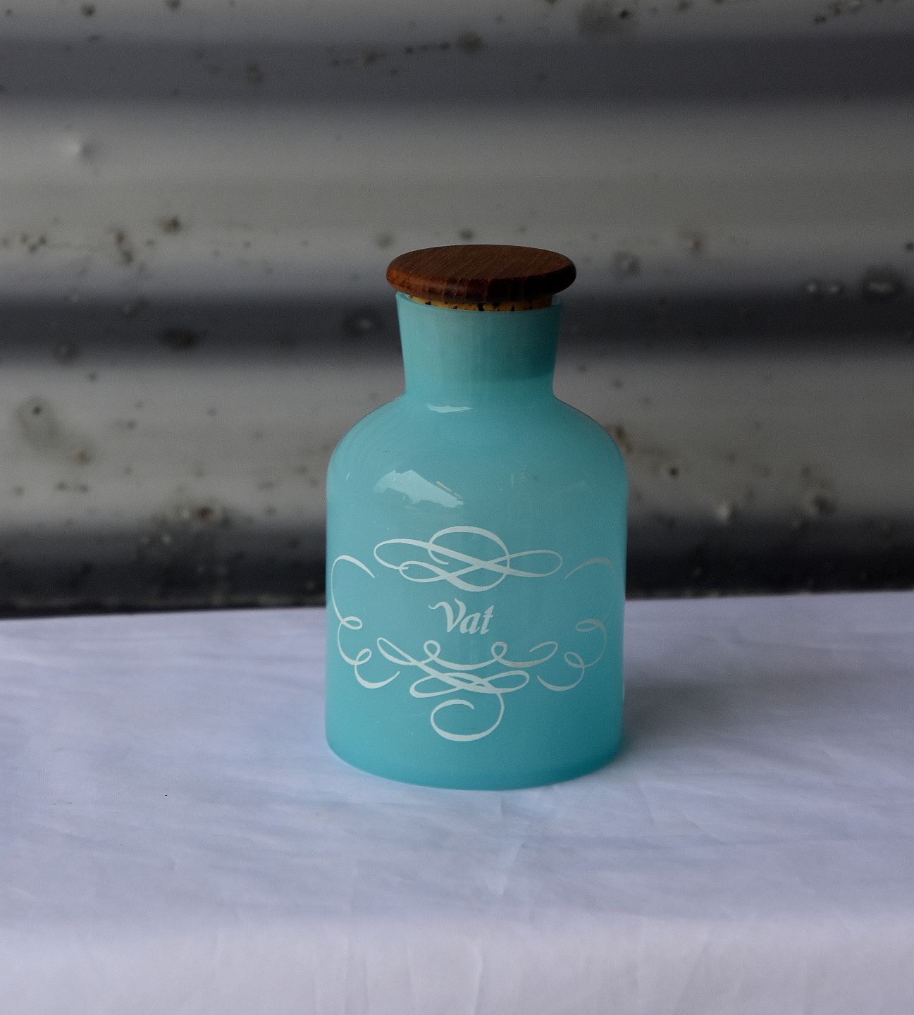 Lyseblå glaskrukke, til vat, med teaklåg