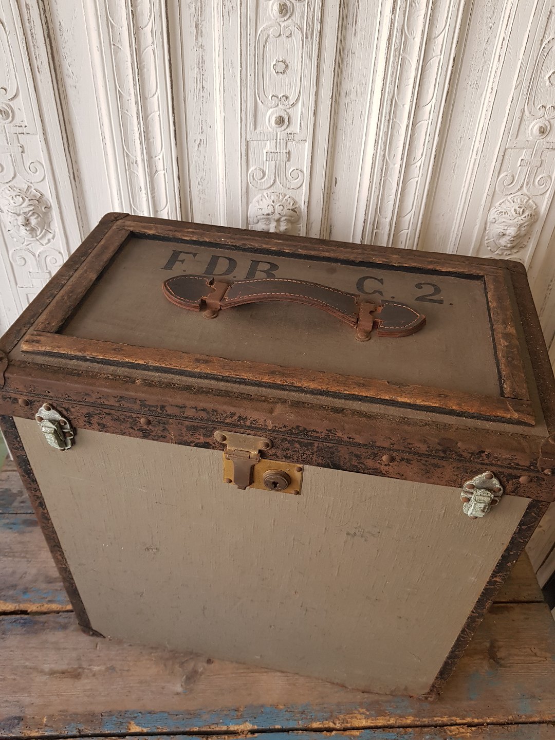 Gammel rejsekuffert/repræsentant kuffert med metalbeslag fra F.D.B.