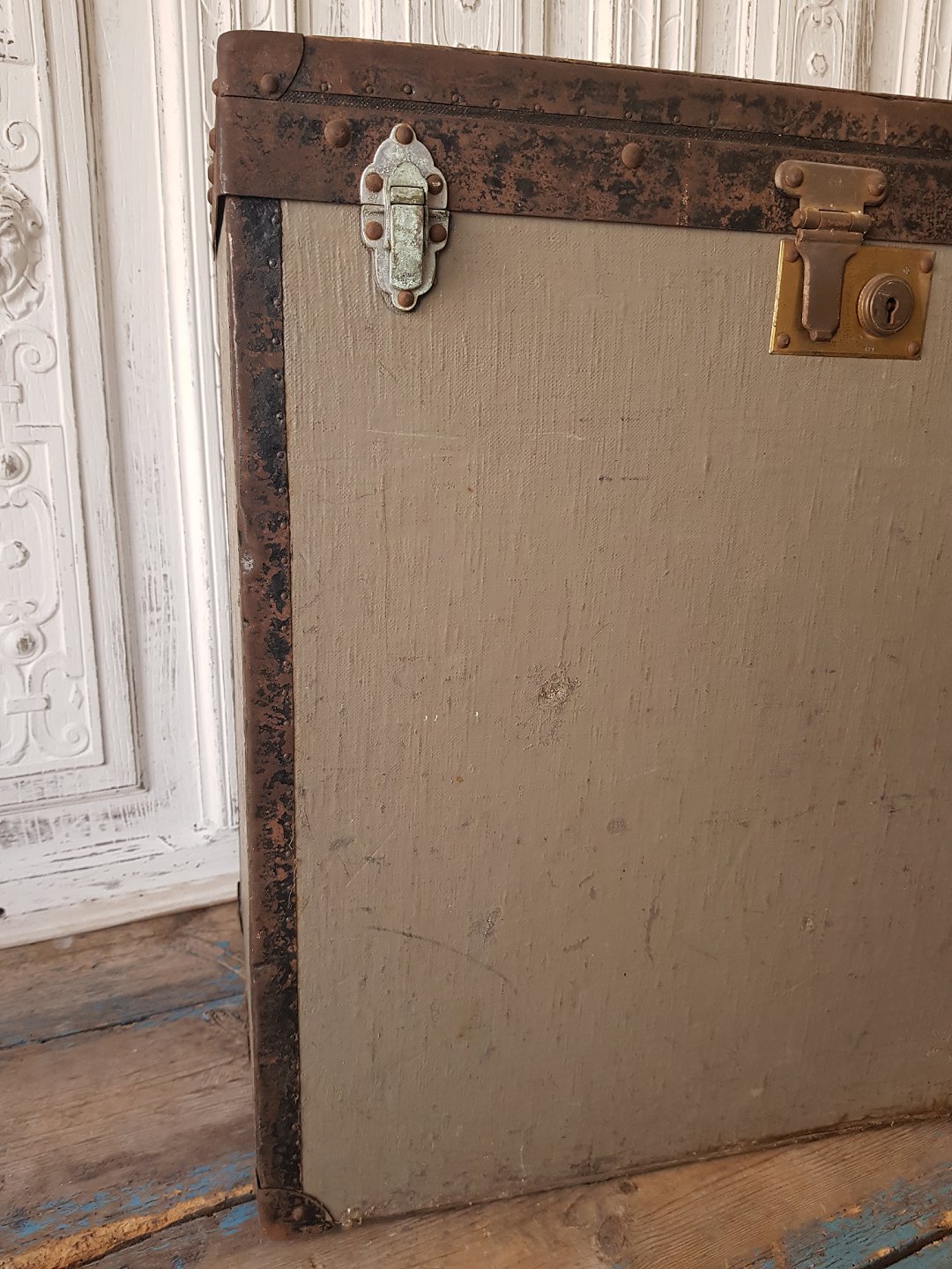 Gammel rejsekuffert/repræsentant kuffert med metalbeslag fra F.D.B