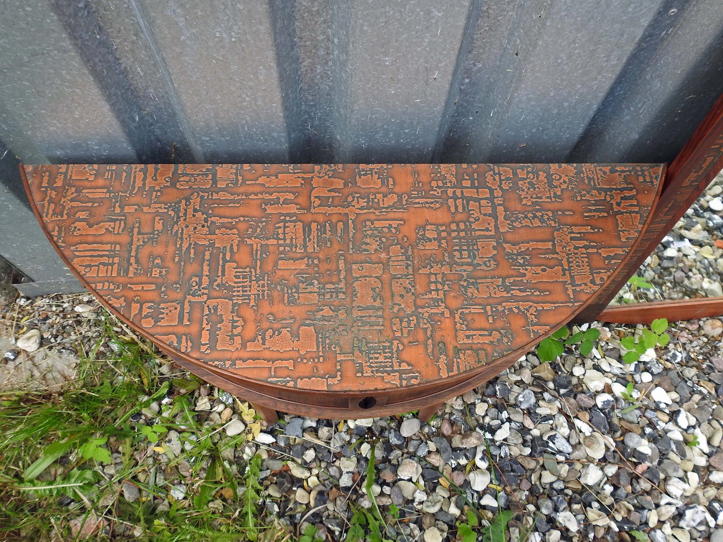 Entrsæt bestående af spejl med indlagt mønster samt opbevaringsmøbel med jalousi låger og mønstret topplade i kobber, lavet i Palisander.