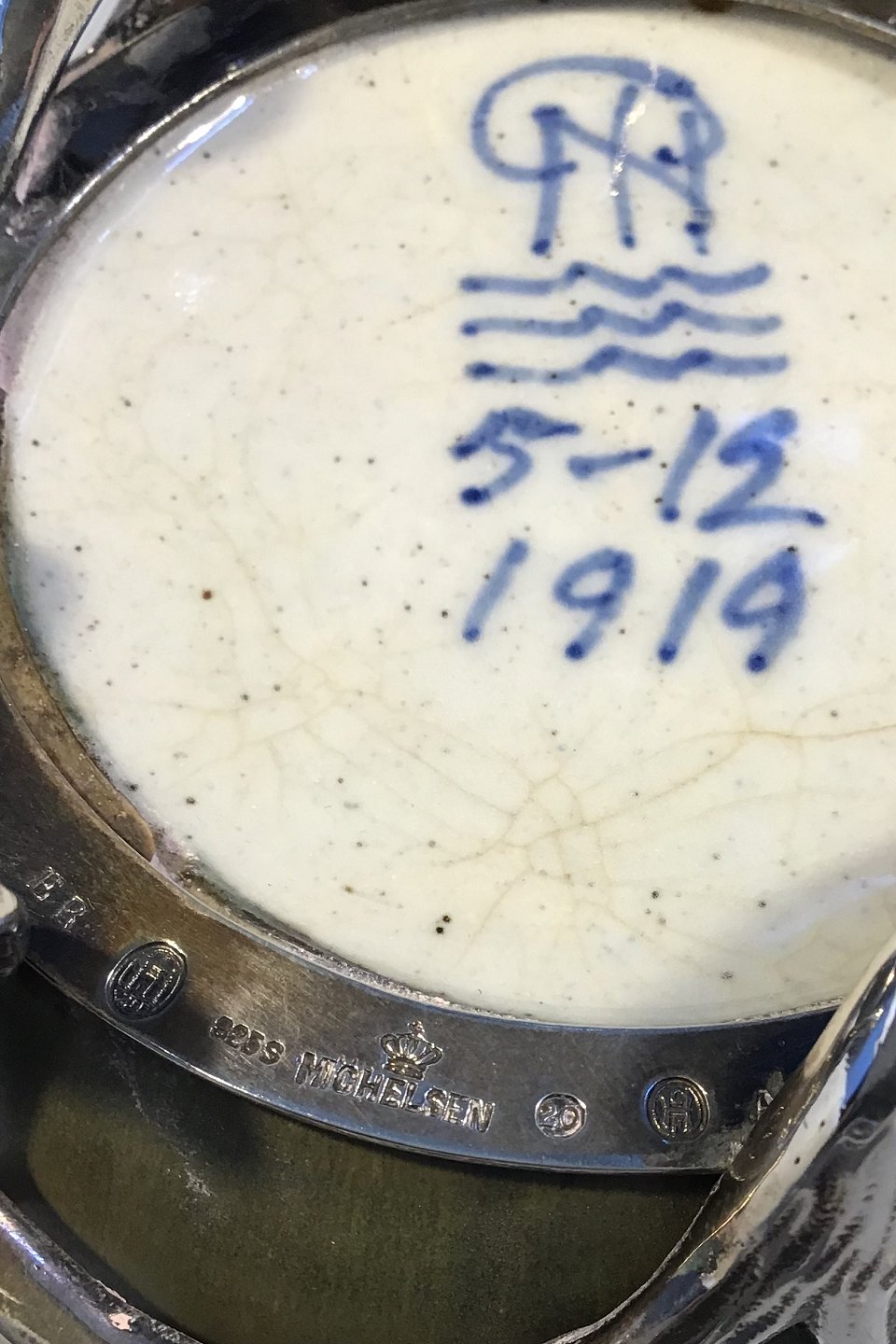 Royal Copenhagen, krukke af stentøj med grøn Sung glasur, Anton Michelsen montering med låg af Sterlingsølv med bladværk og drueklaser af i alt 30 ametyster. Signeret PN, tre bølger og dateret 5/12 1919. Sølvmonteringen stemplet Michelsen, 1920, ER, 925S, guardein Carl Frederik Heise. H. inkl. låg 14,5 cm, Diam 12 cm.