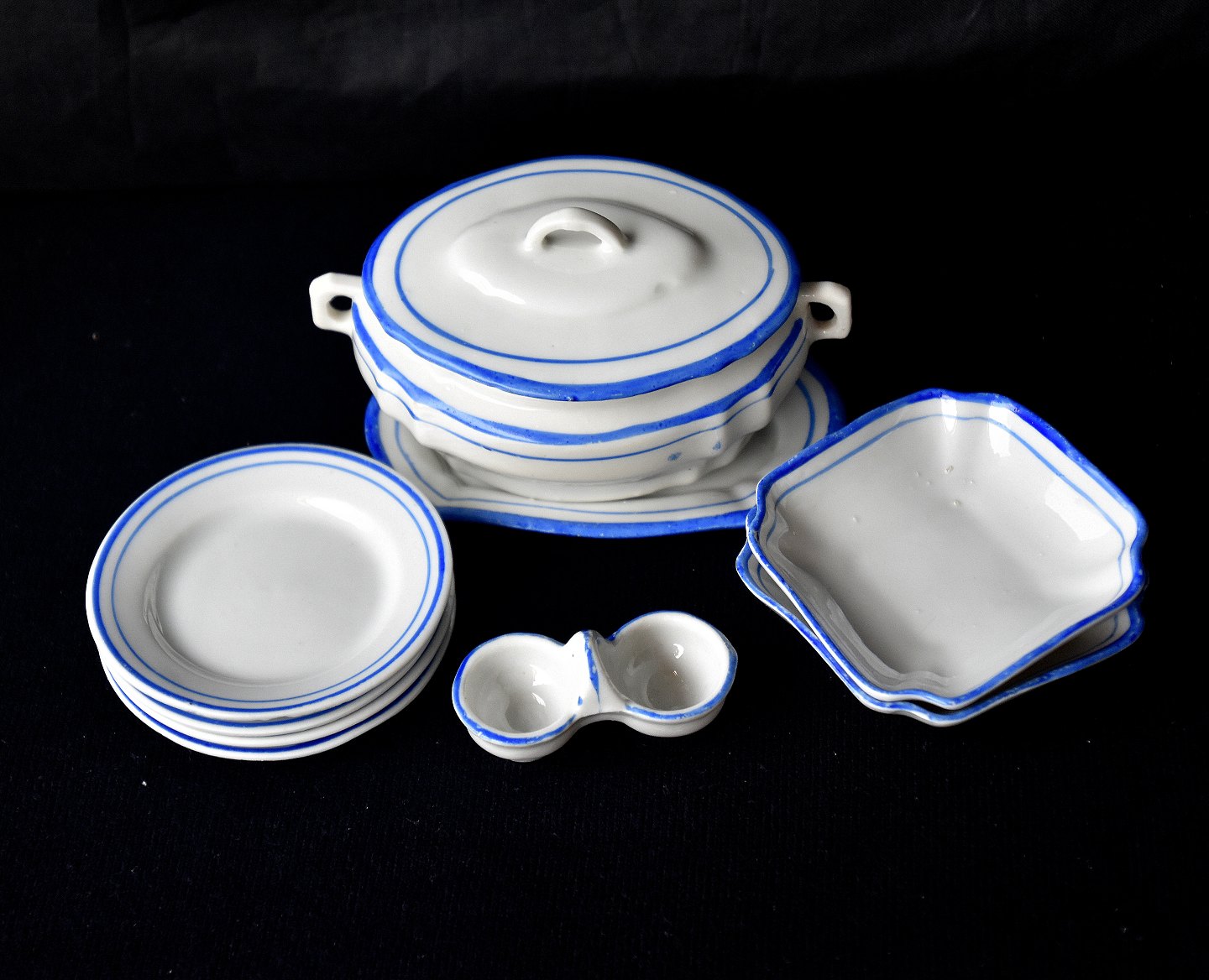 Miniatureporcelæn med blå kant, eventuelt til dukkehus. Sættet består af 1 terrin, 3 fade, 4 tallerkener 1 Cabaretfad