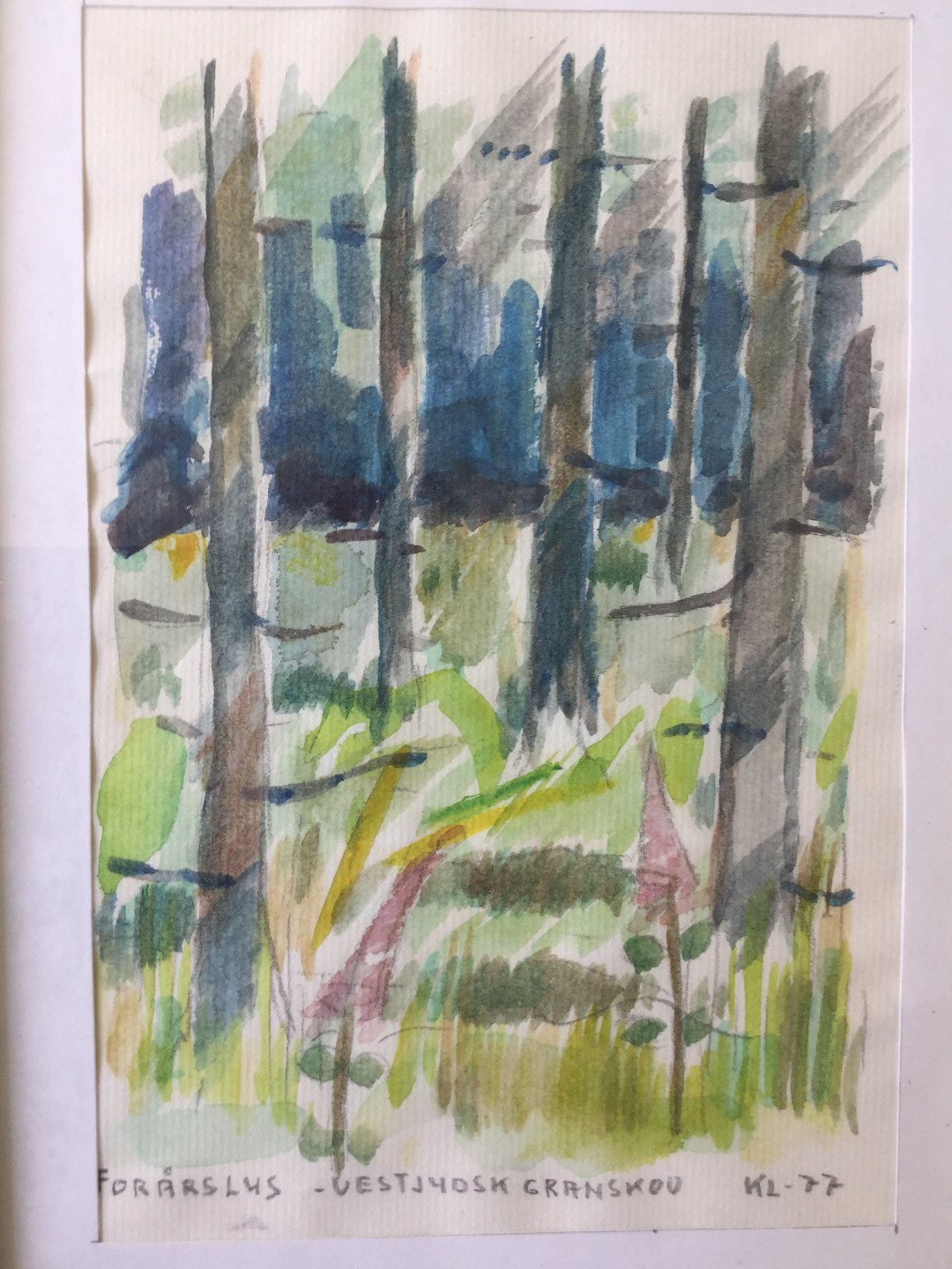 Akvarel af Knud Laursen - Forårslys - Vestjysk Granskov 1977.