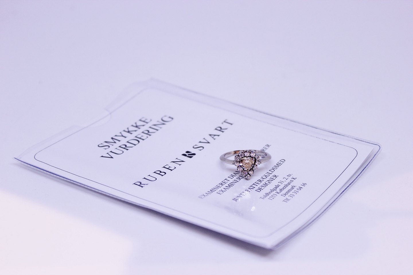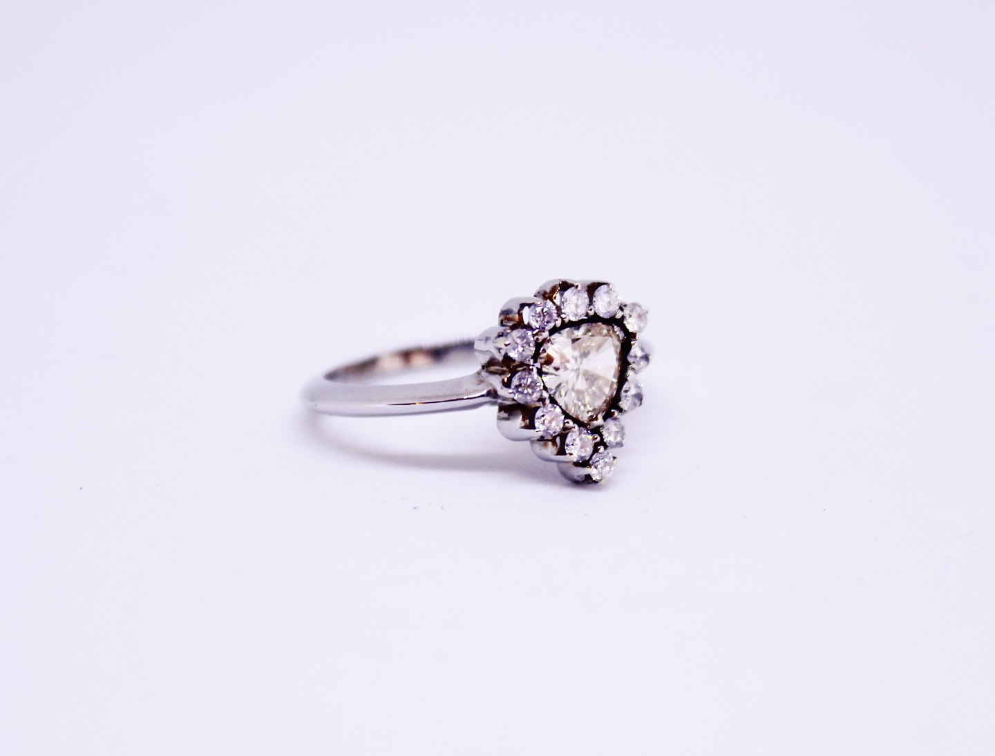 Ring af 14 kt. hvidguld dekoreret med 13 diamanter. En triangel formet diamant af 0,72 kt. i farven lys champagne og klarhed S12. Samt 12 mindre diamanter af 0,36 kt. og i farven Wesselton.