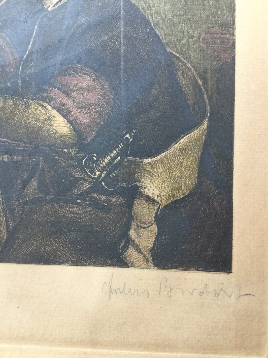 Farveradering Julius Borchert - Piberygende mand i interiør.