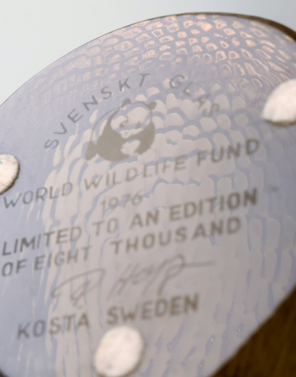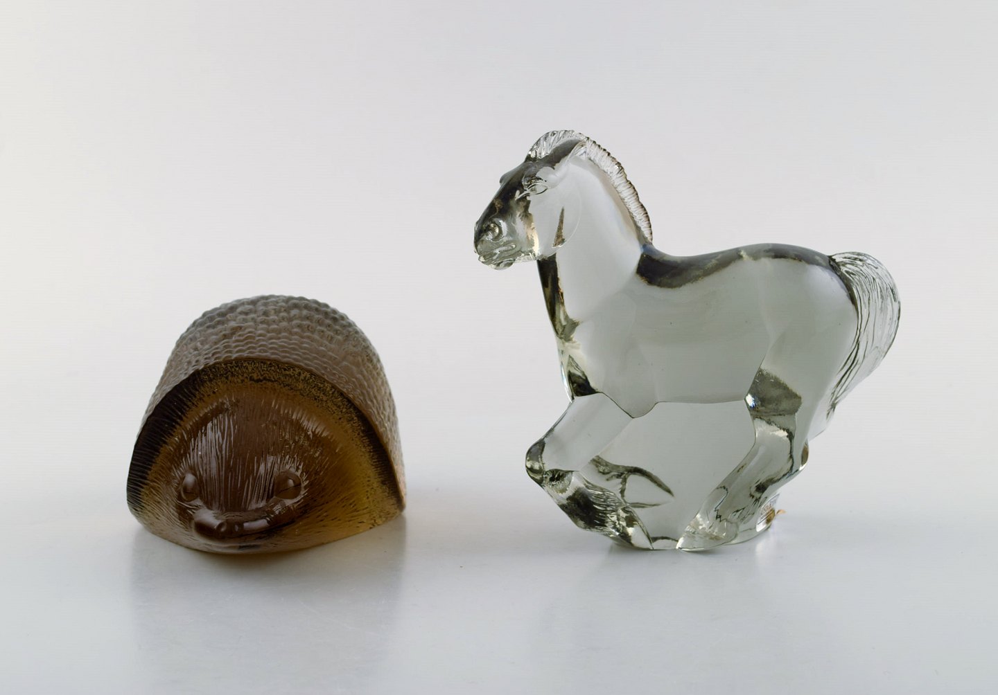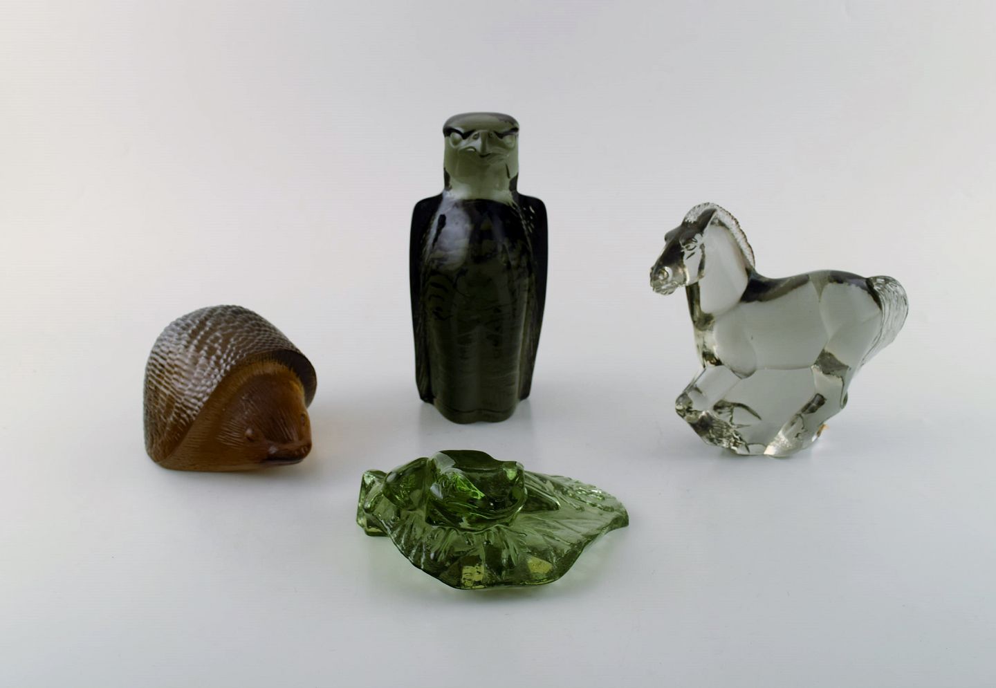 Paul Hoff for Svenskt glas. Fire figurer i form af falk, pindsvin, tudse og hest. kunstglas. WWF. Sent 1900-tallet.