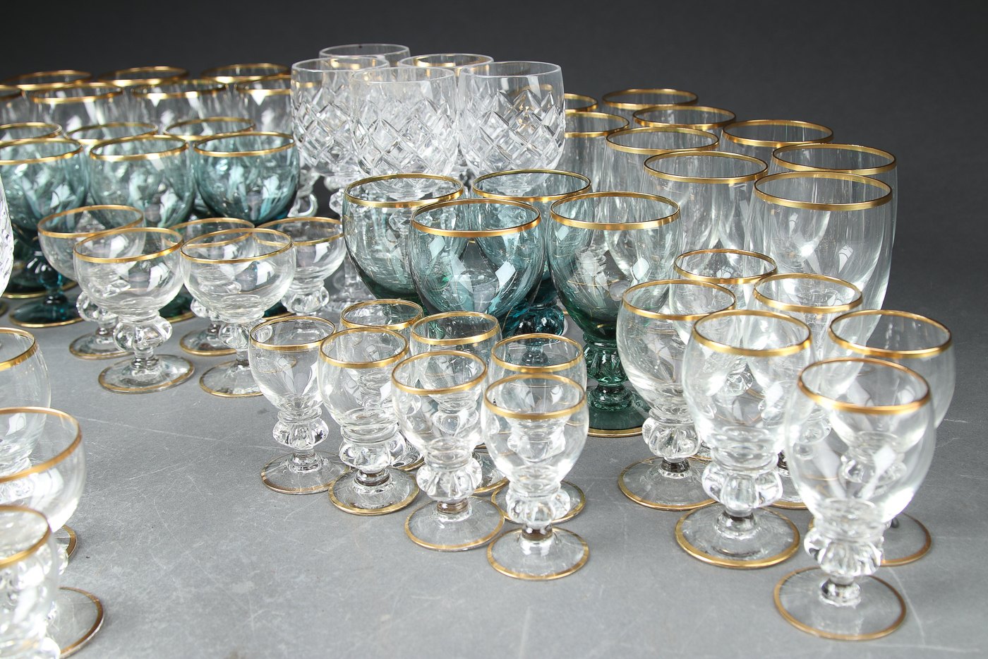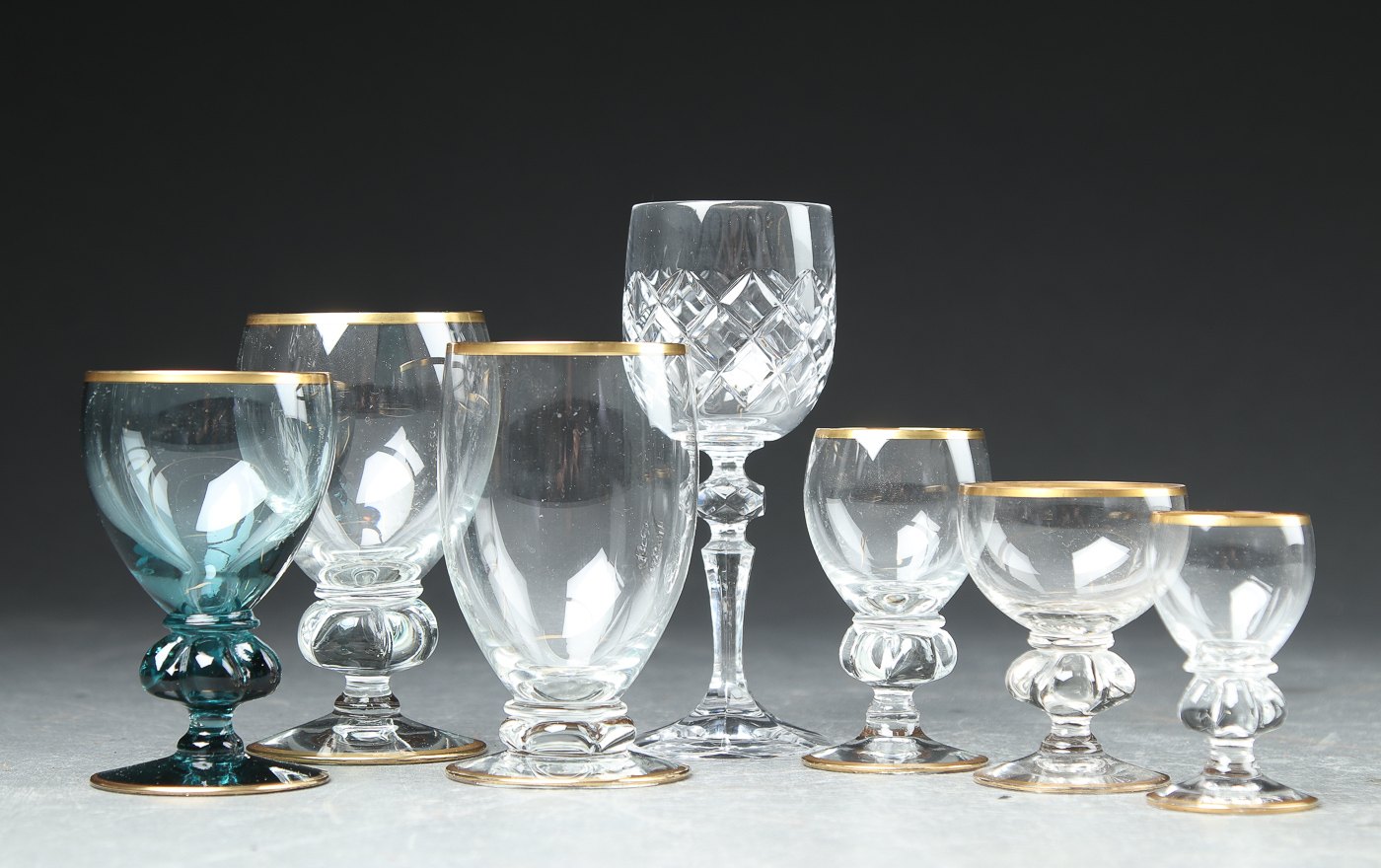 Bestående af: 12 rødvin H. 13,5 cm; 10 øl/vand H. 12,5 cm; 12 kulørte hvidvin H. 11,5 cm; 4 likør H. 8 cm; 2 portvin H. 7,5 cm; 12 snaps H ca. 8 cm. Endvidere 11 portvin H. ca.10 cm.