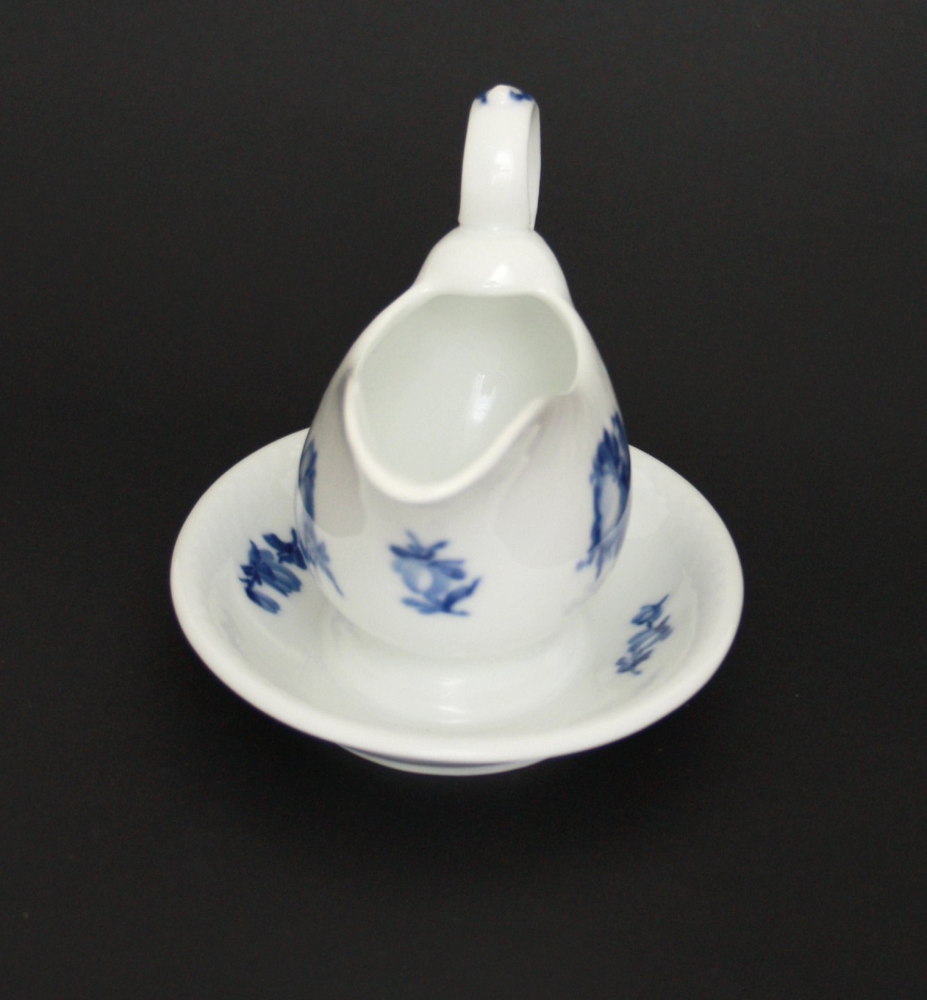 Royal Copenhagen, Blå Blomst flettet, Saucekande med hank og fast underfad. Nr. 10/8068. Højde 12 cm. Længde 18 cm. I. sortering. Pris: 775 kr.