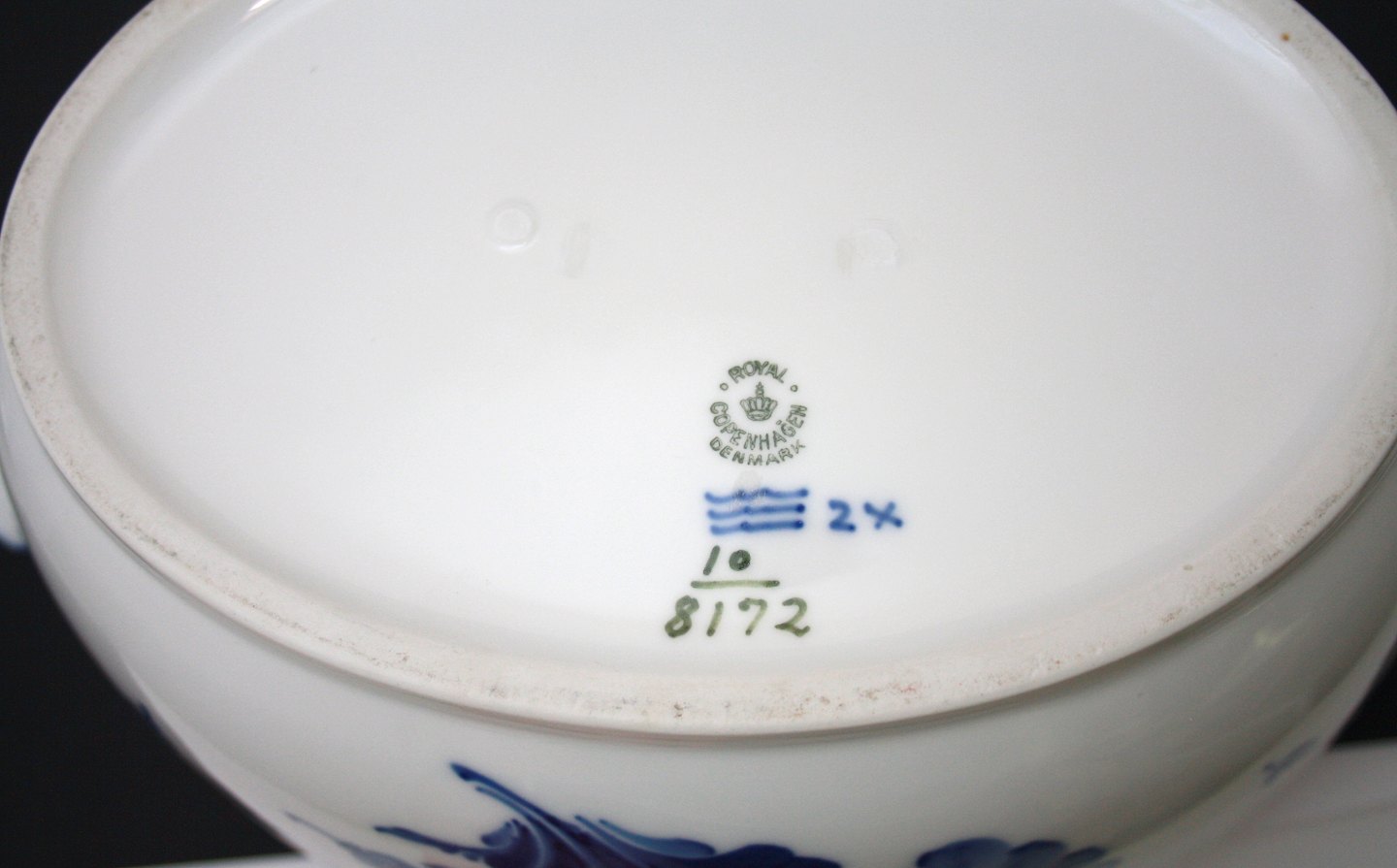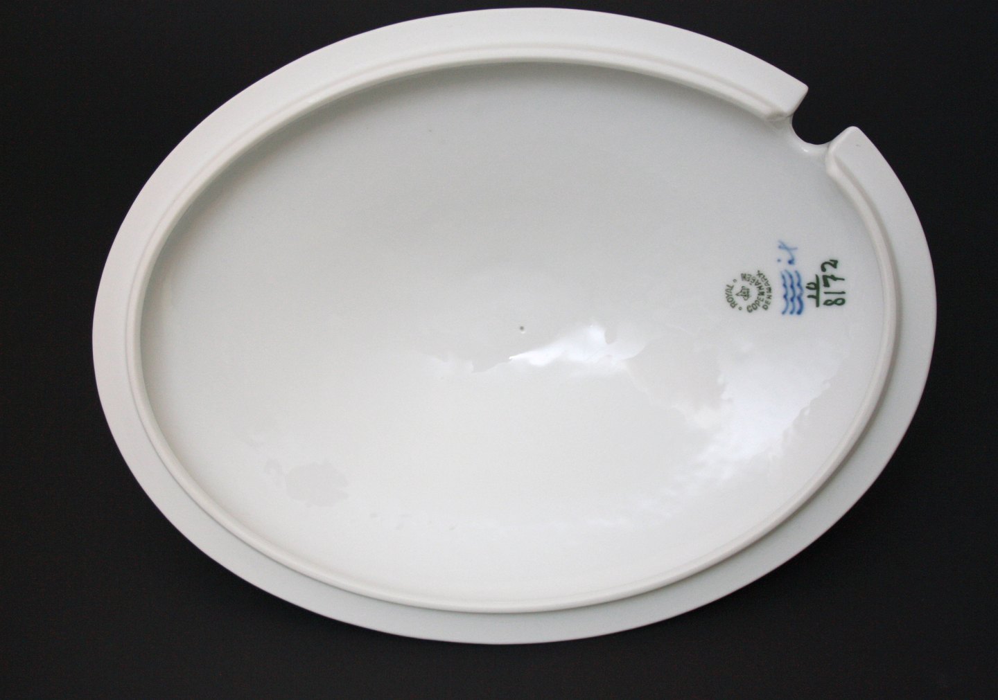Royal Copenhagen, Blå Blomst flettet, Oval suppeterrin med låg. Nr. 10/8172. Højde 20,5 cm. Længde 31,5 cm. Bredde 19 cm. II. sortering. Pris: 2.500 kr. stk. Lager: 2