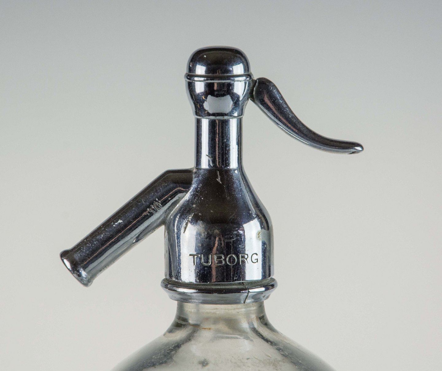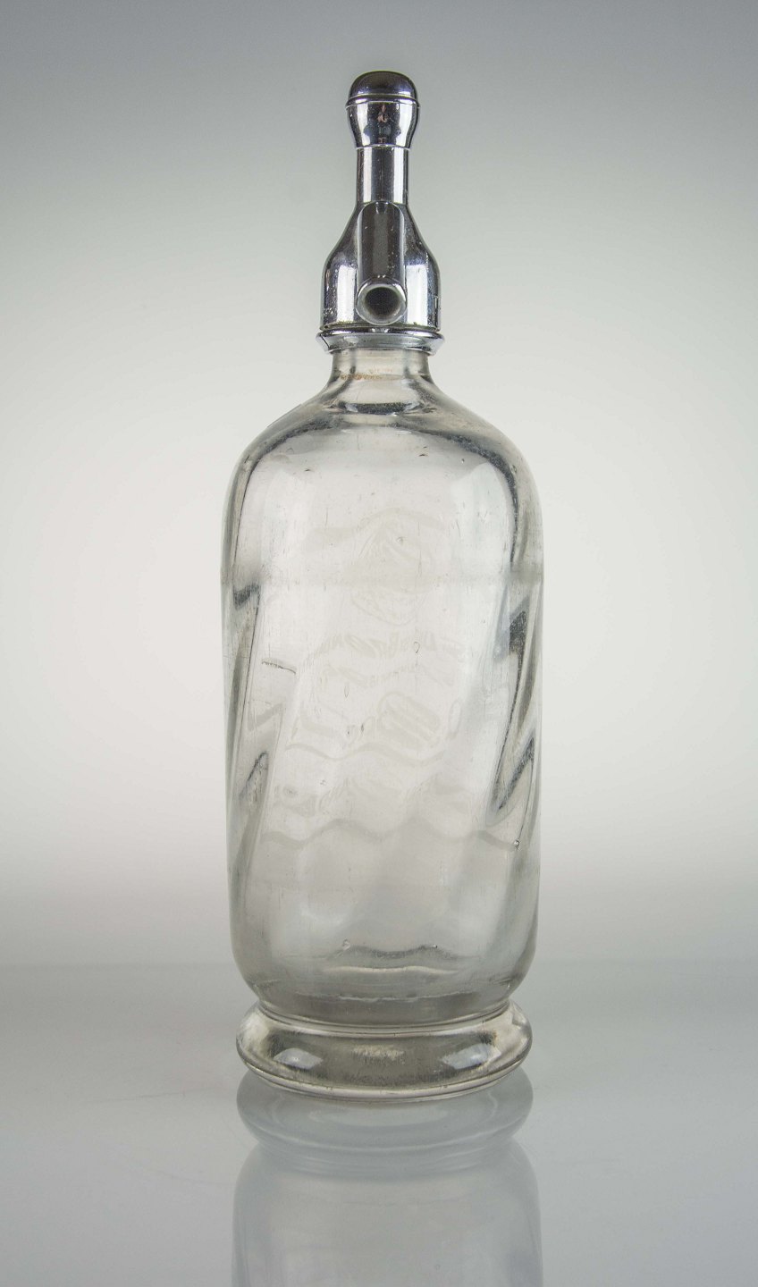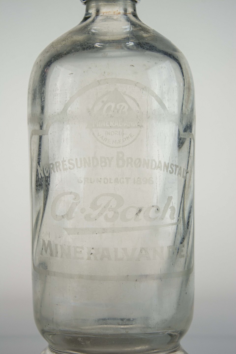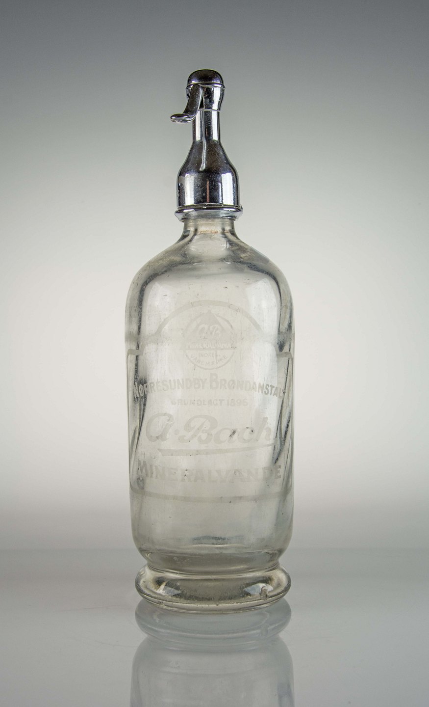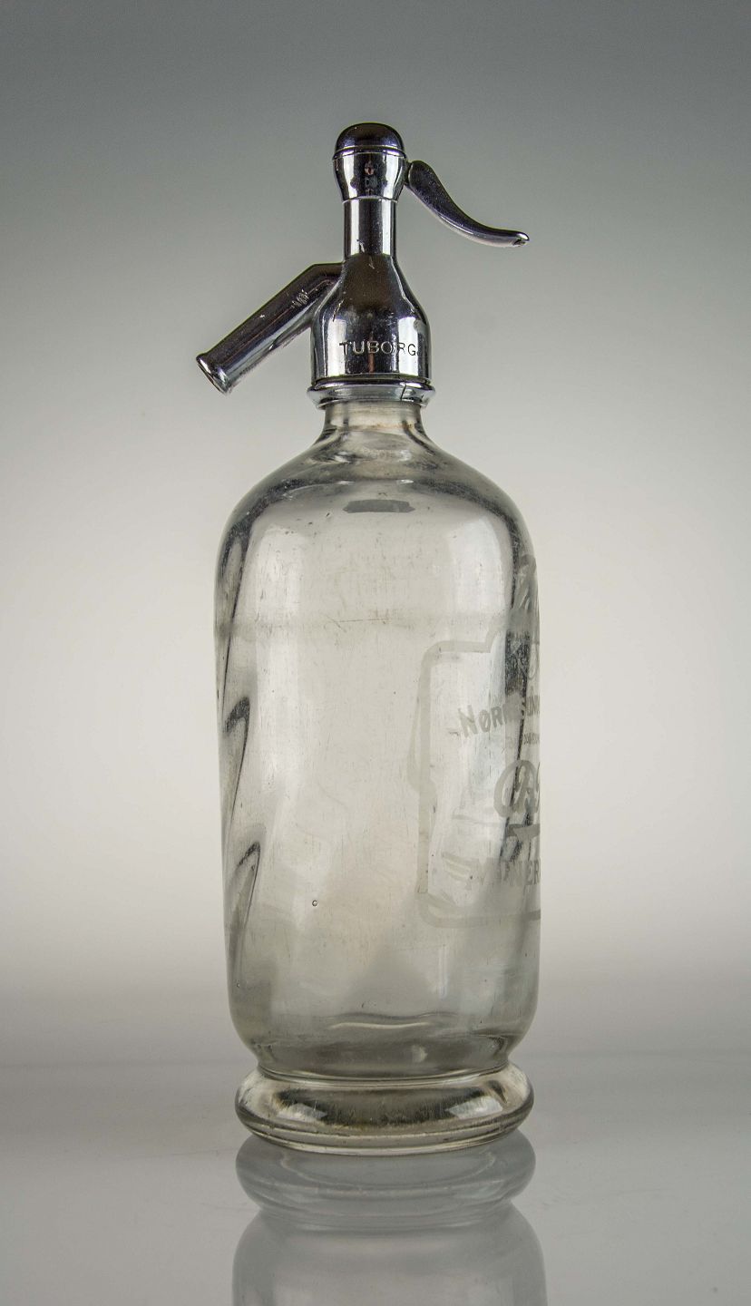 Sifonflaske i glas og metal med teksten Nørresundby Brøndanstalt