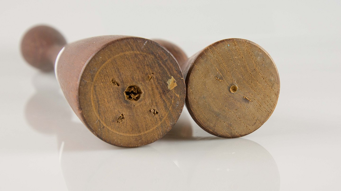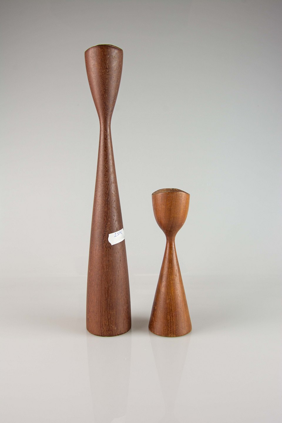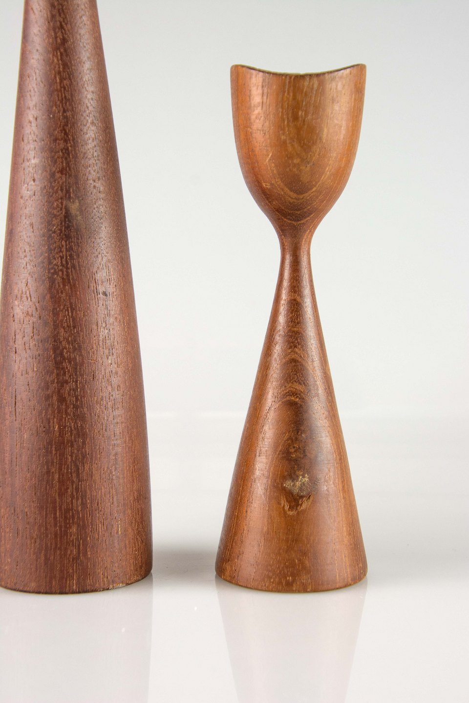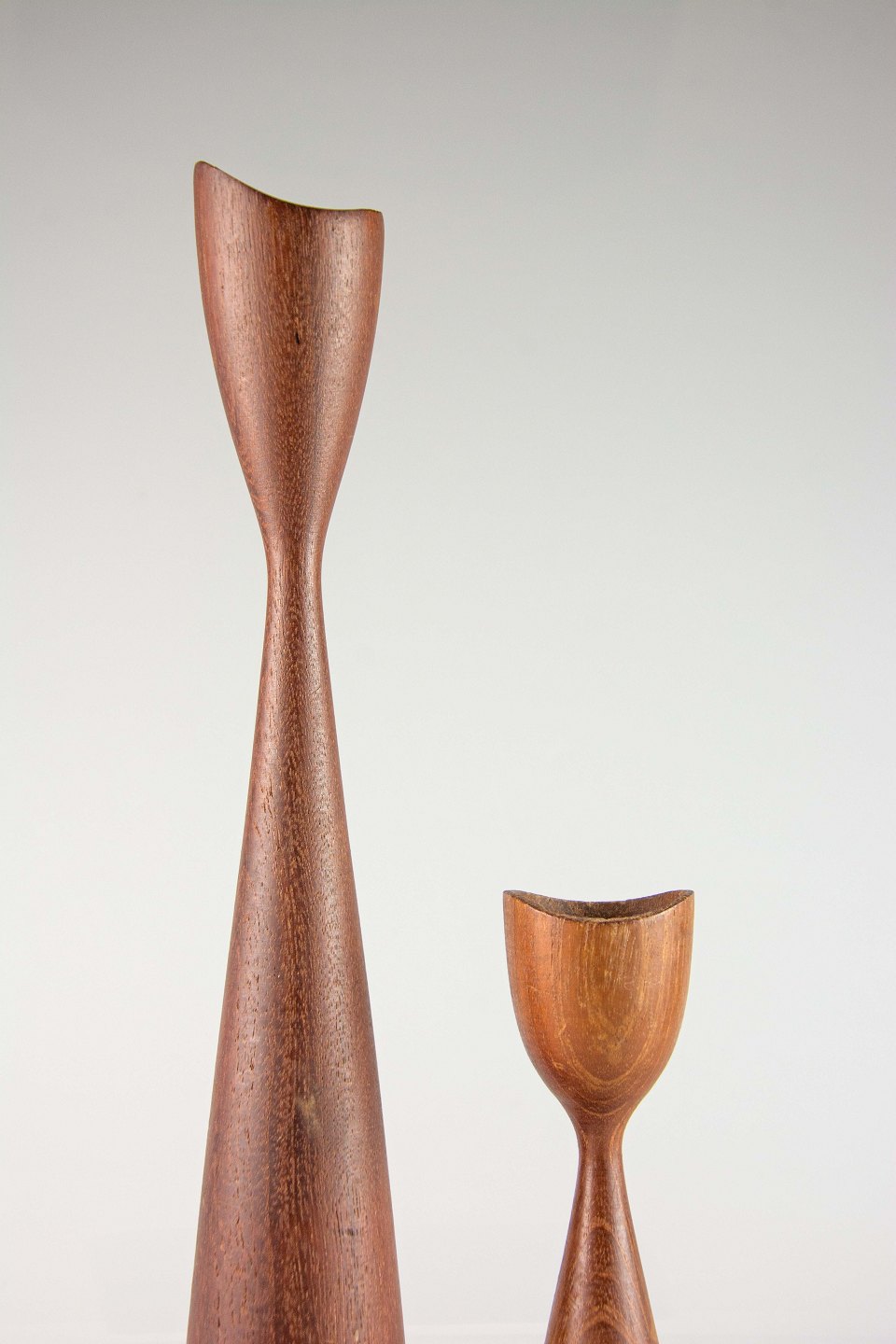 Et sæt lysestager i teaktræ med svungen topkant