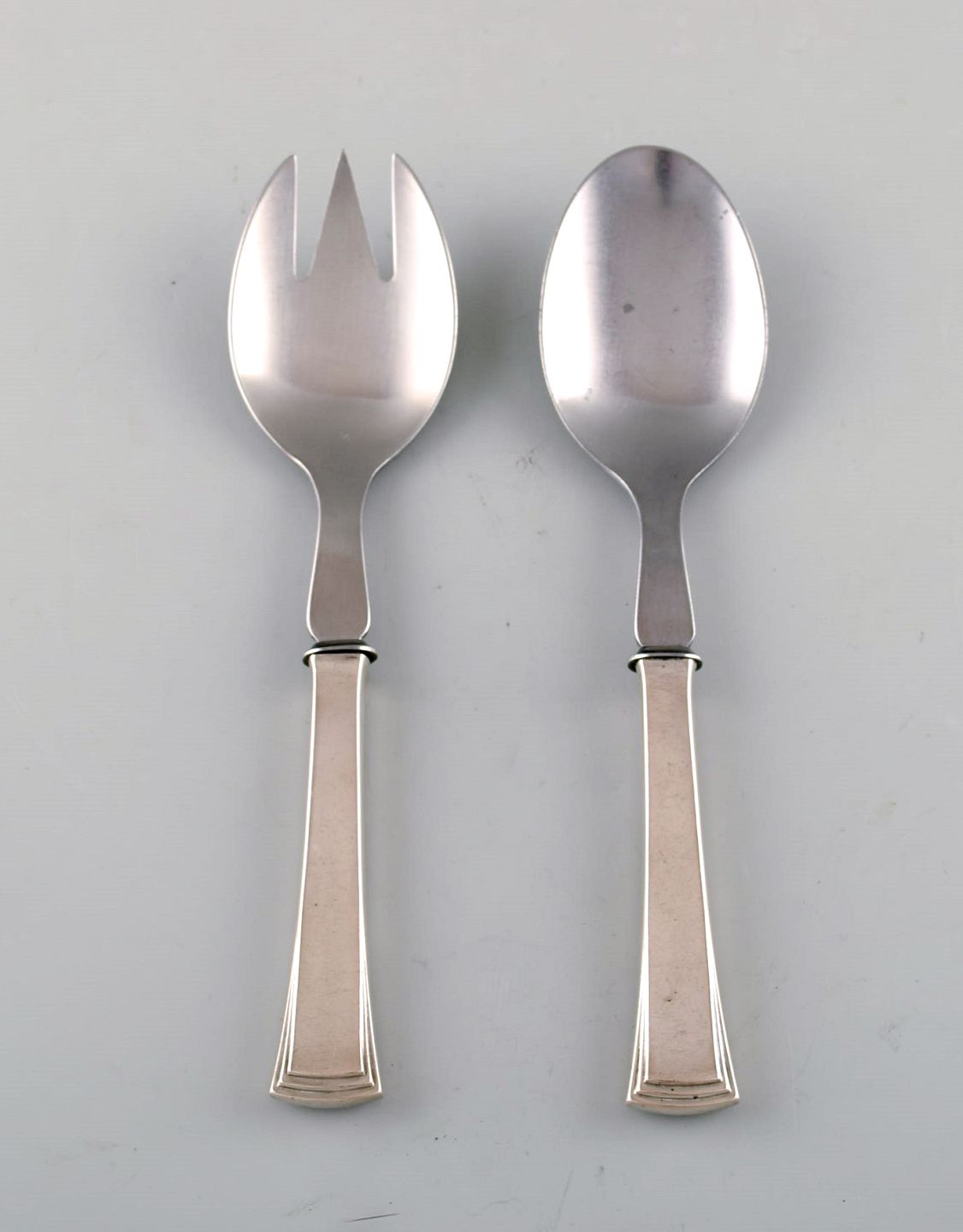 Evald Nielsen nummer 32 salatsæt i tretårnet sølv og rustfrit stål.