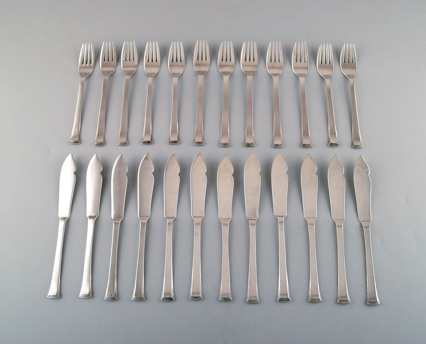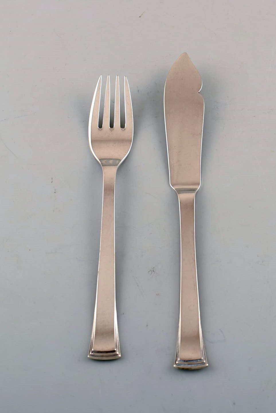 Evald Nielsen nummer 32 fiskebestik i tretårnet sølv. Komplet service til tolv personer.