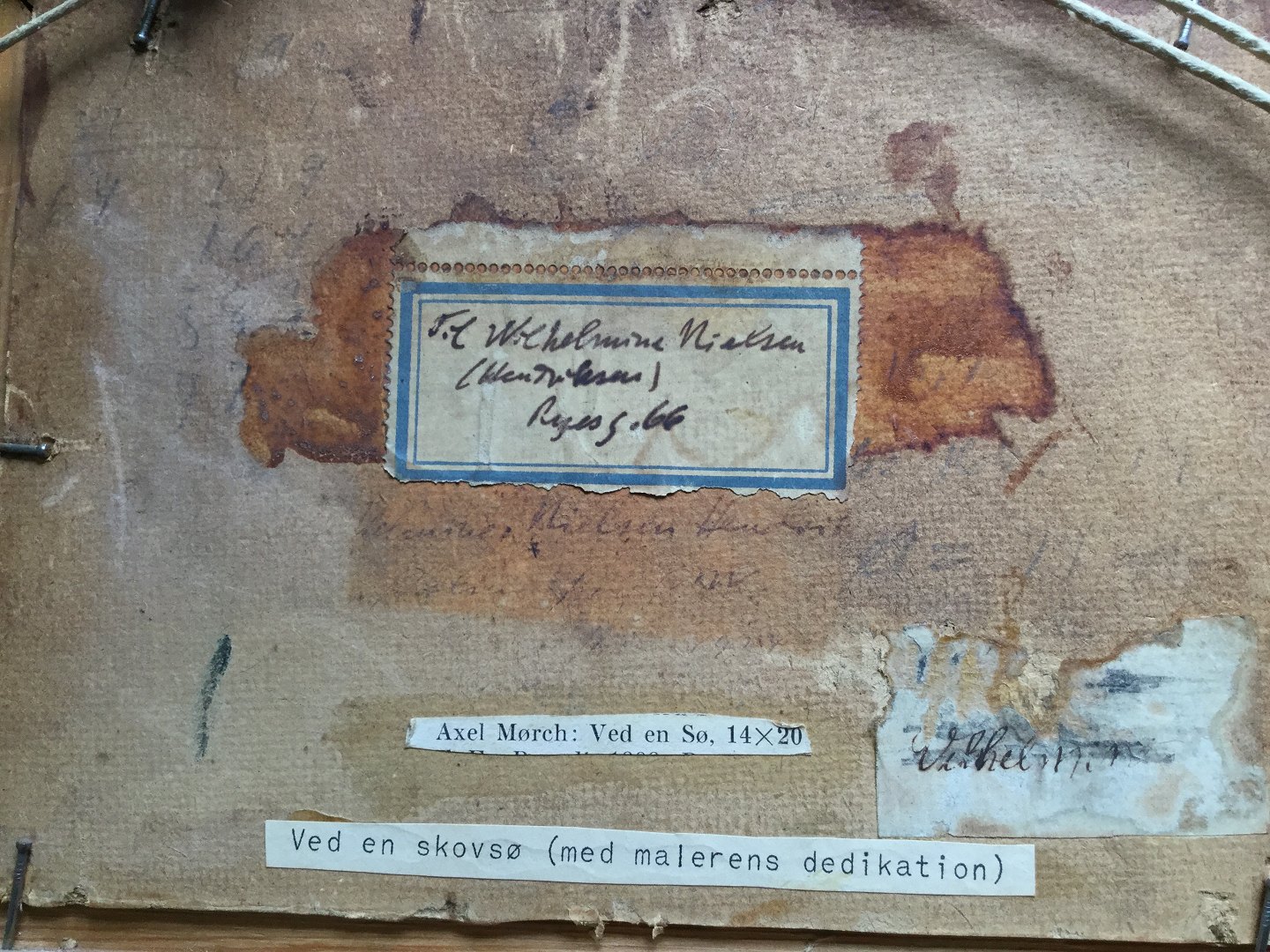 Bagpå "Ved en skovsø" samt auktions- og udstillings- numre/mærkater.