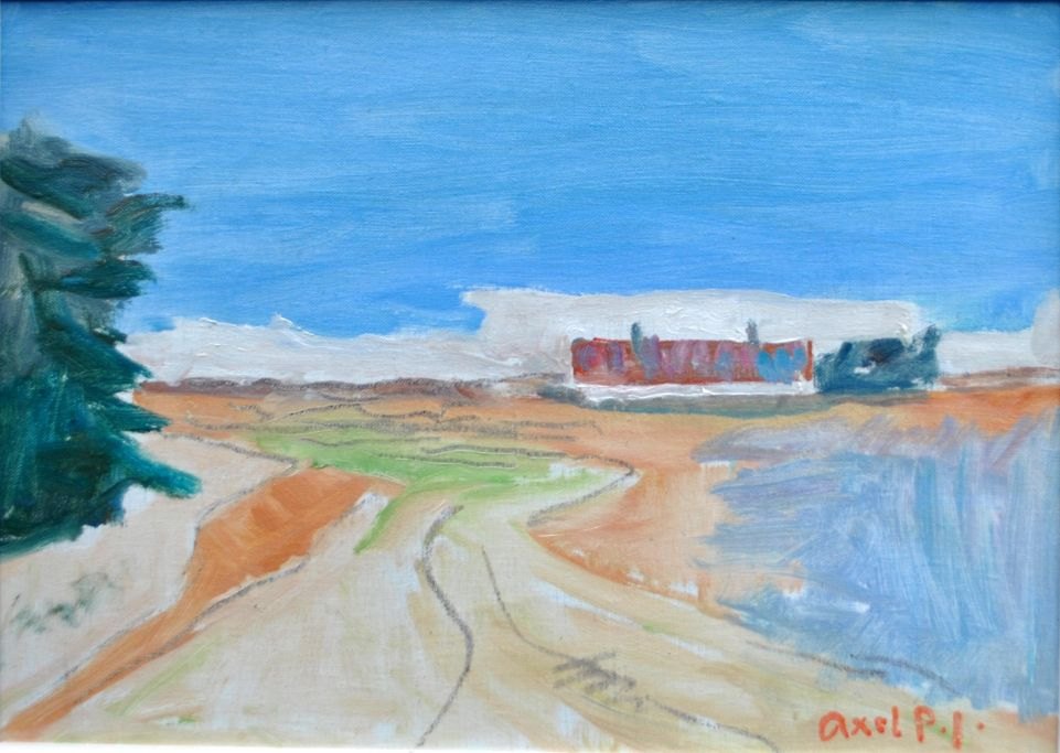 Jensen, Axel P. (1885 - 1972) Danmark: Landskab med gård. Olie på lærred. Signeret. 33 x 46 cm.