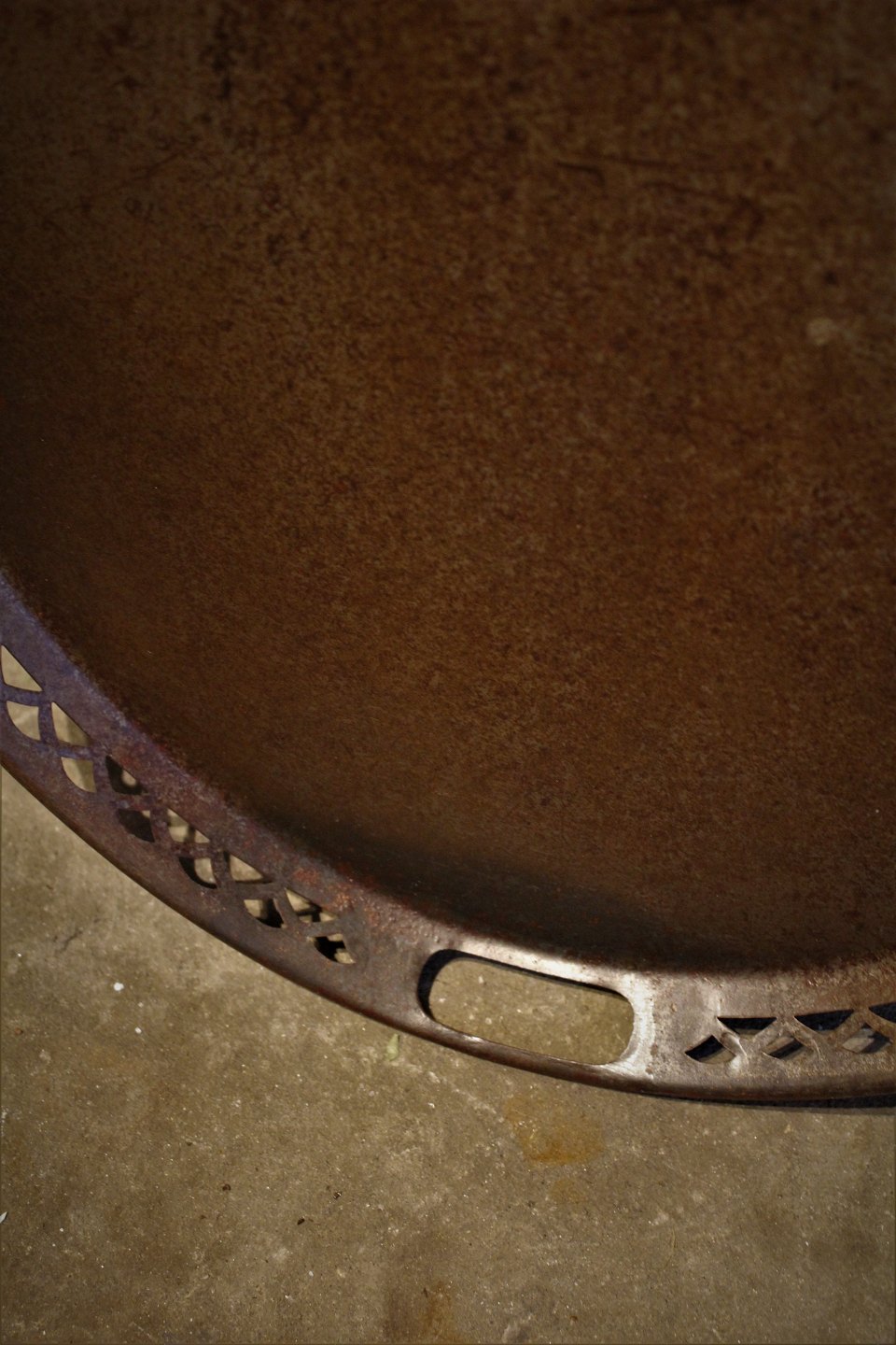 Gammel rå Fransk oval bakke i afpudset jern med hul mønster langs kanten og med en super fin patina.