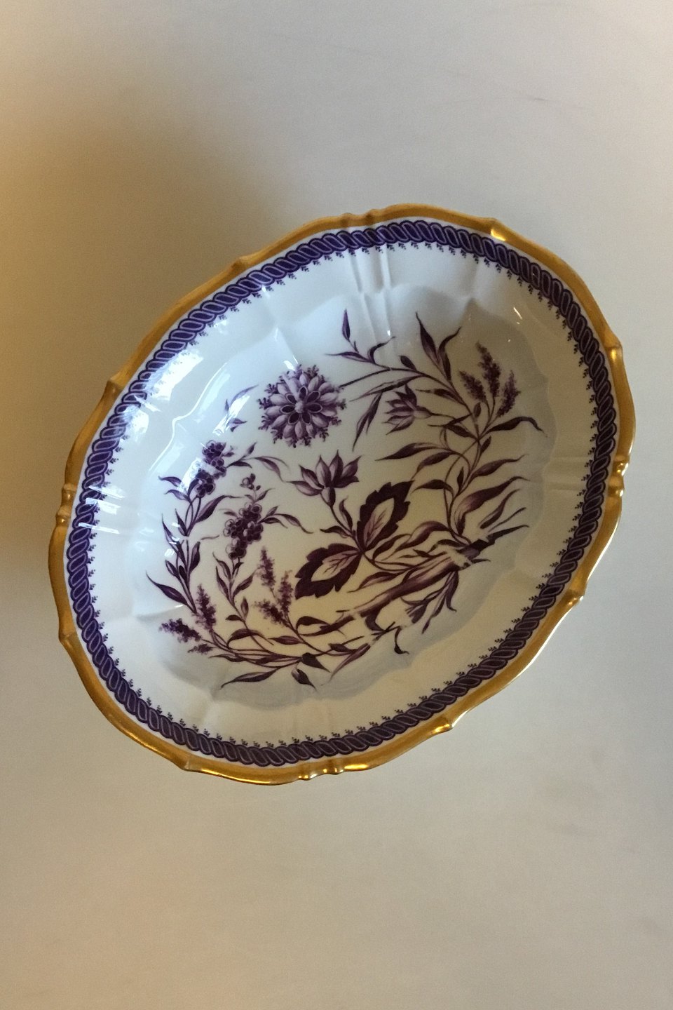 Bing & Grøndahl Art Nouveau Oval skål på fod med lilla blomsterdekoration. Måler 28 cm x 23 cm x 8 cm
