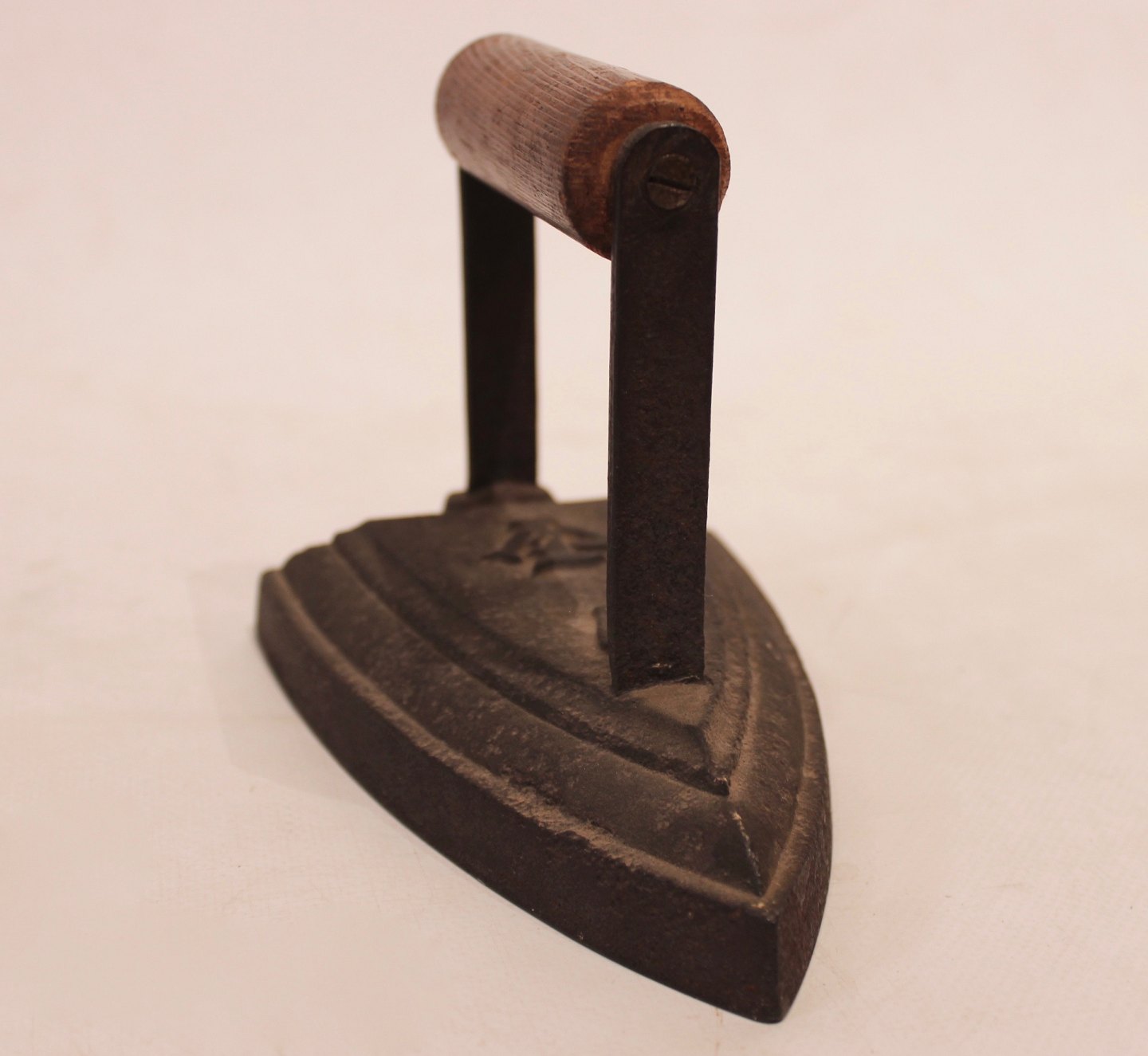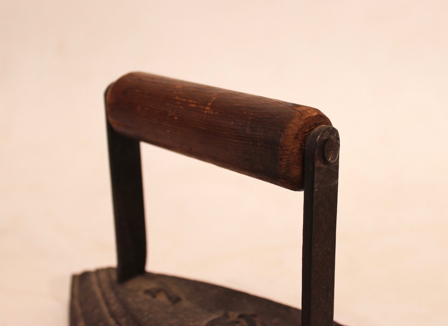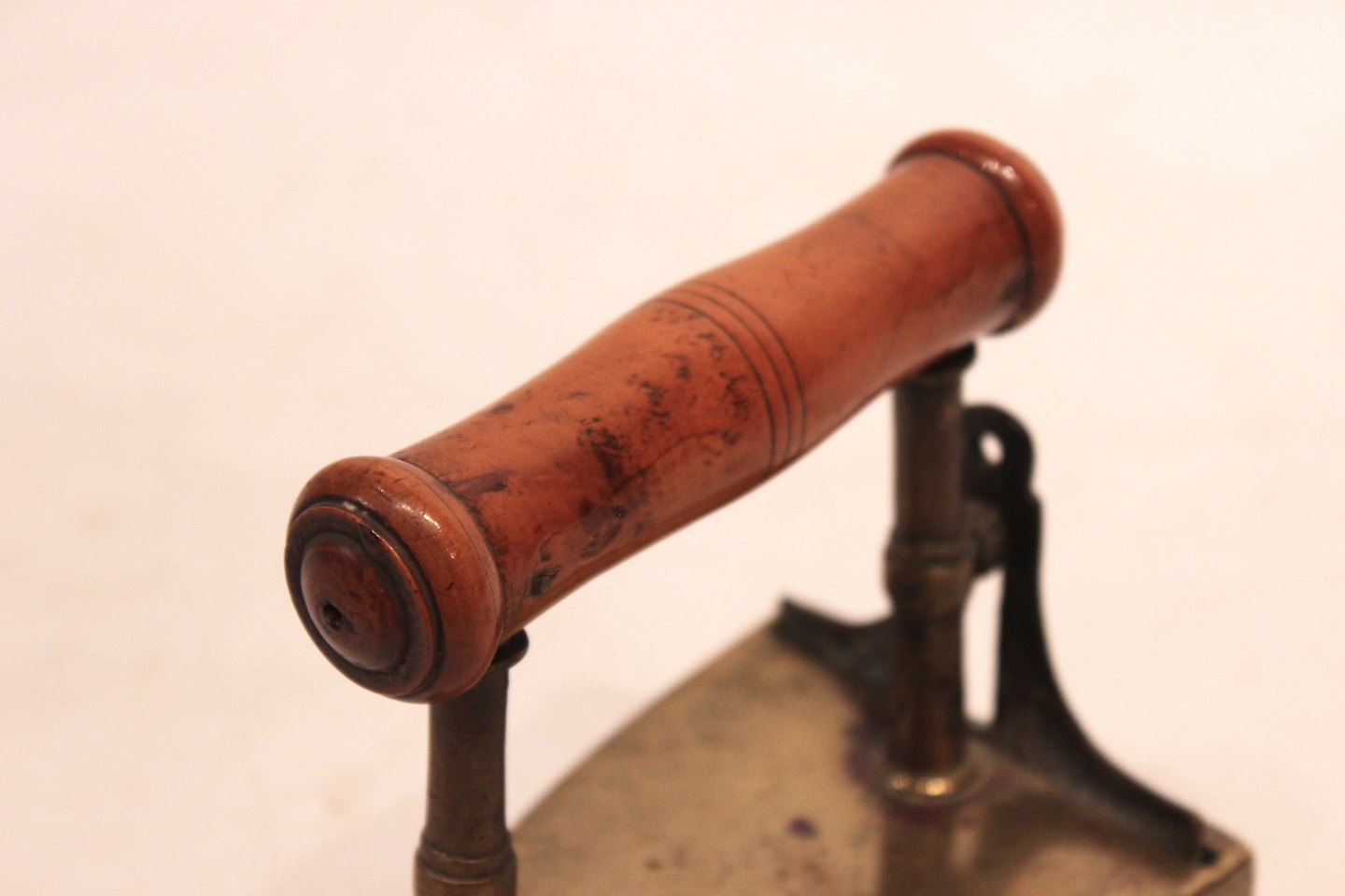 A pair of antique irons, both with wooden handles and of respectively iron and brass. Both are in great vintage condition.