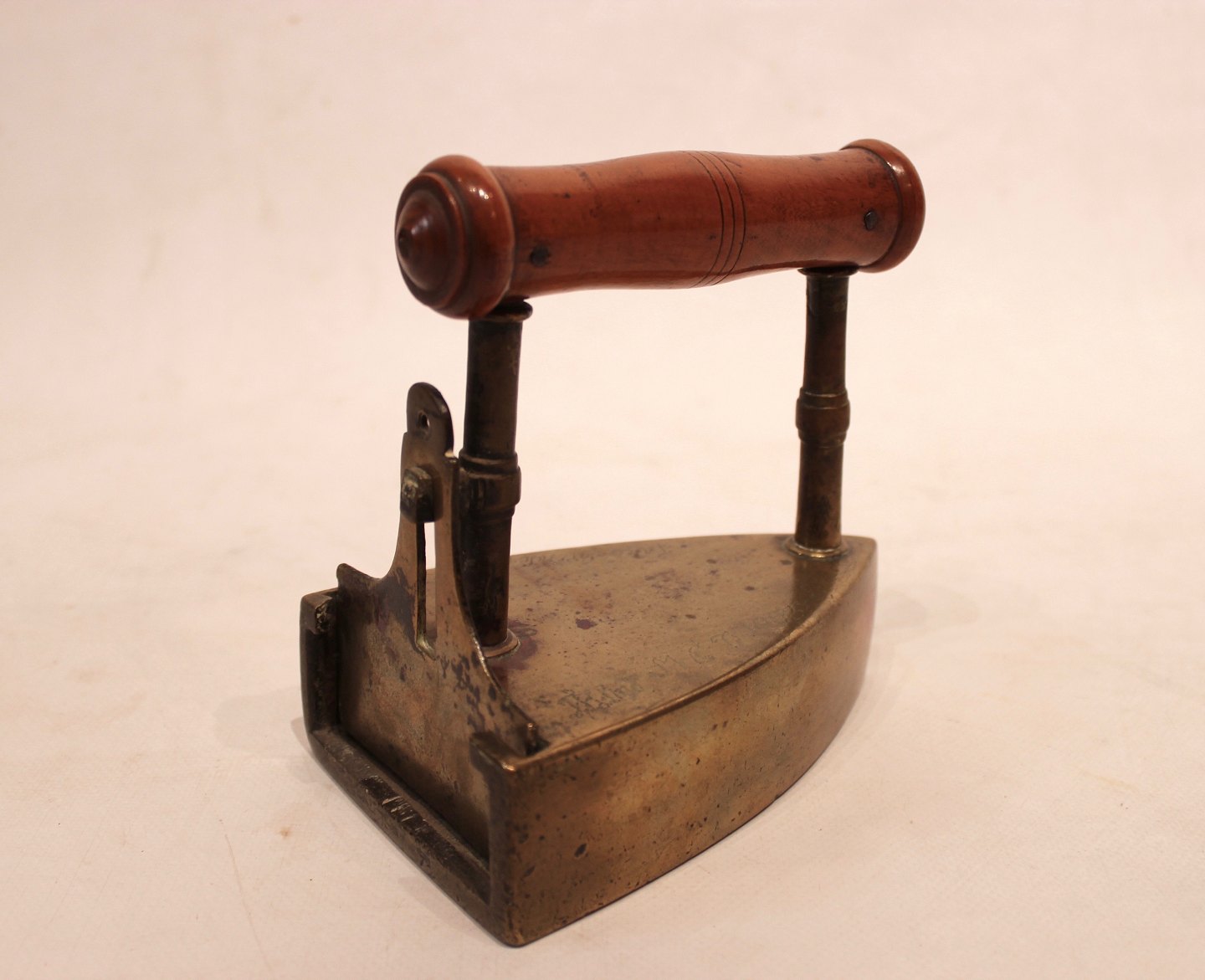 A pair of antique irons, both with wooden handles and of respectively iron and brass.