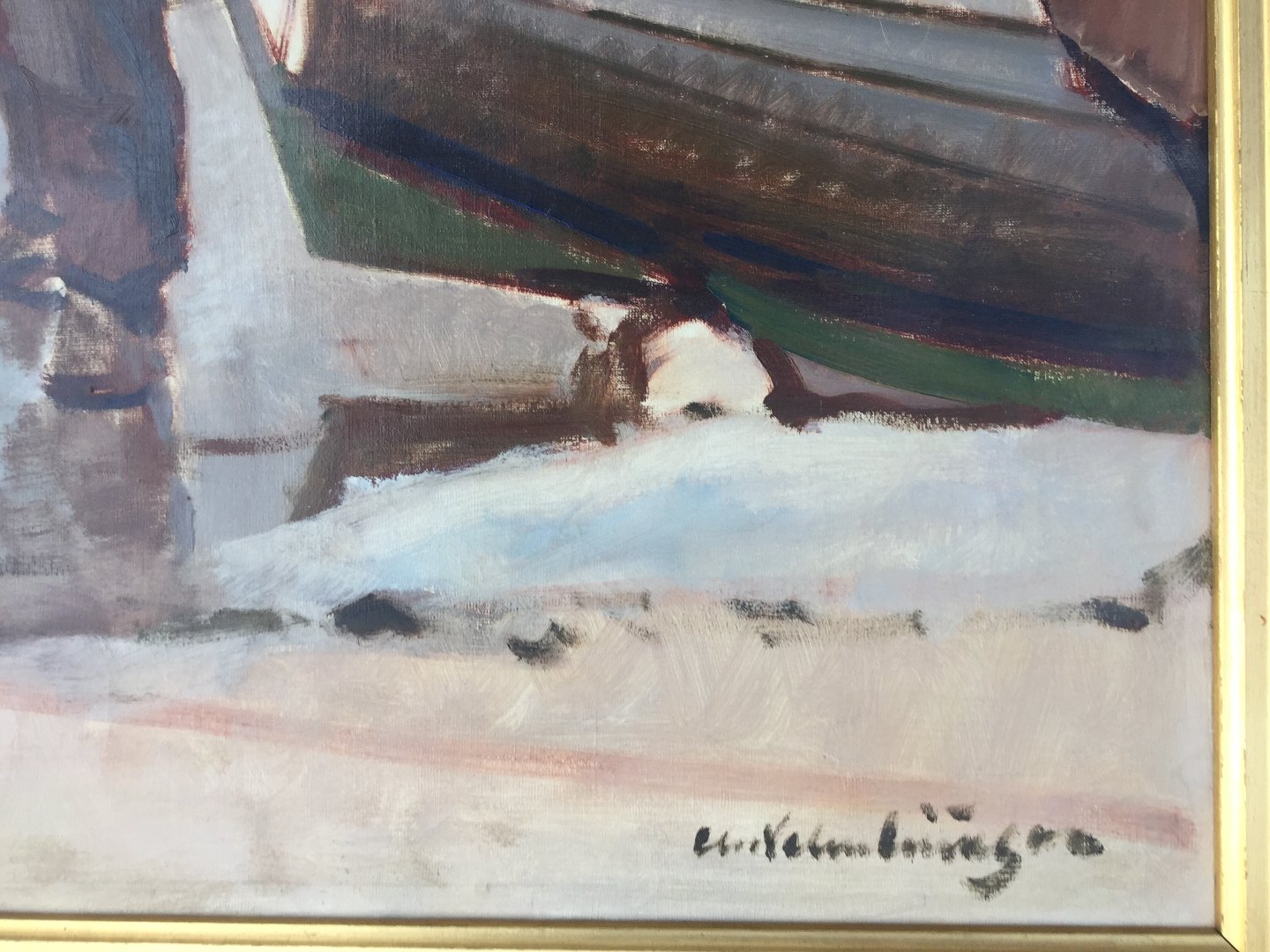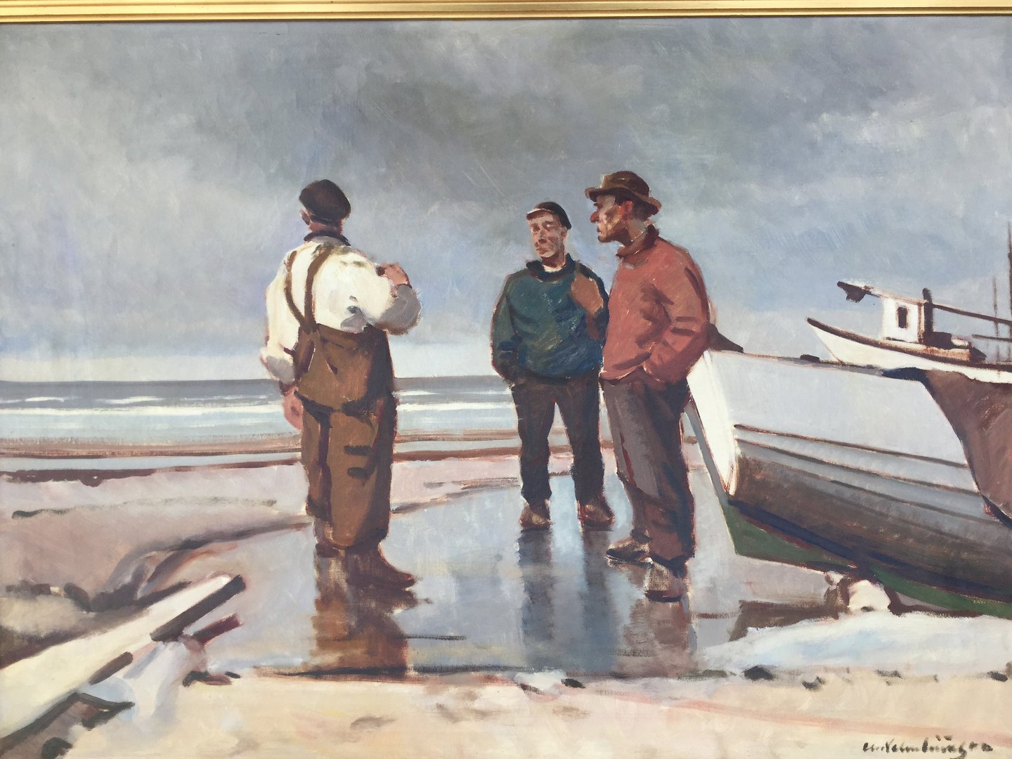 Maleri af Christian Valentinussen - 3 fiskere på stranden ved Vestkysten.