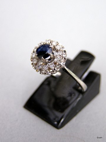 Hvidgukdsring 585 m. Blå Safir 3,2 g. Og Brillanter 0,24 ct.