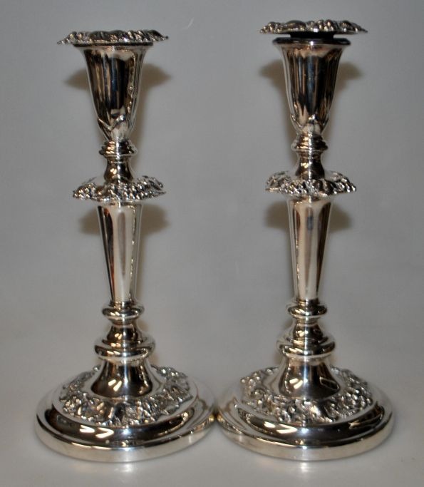 Par forsølvede stager, 19. årh. England. Dekoration med vinløv. H.: 25,4 cm.