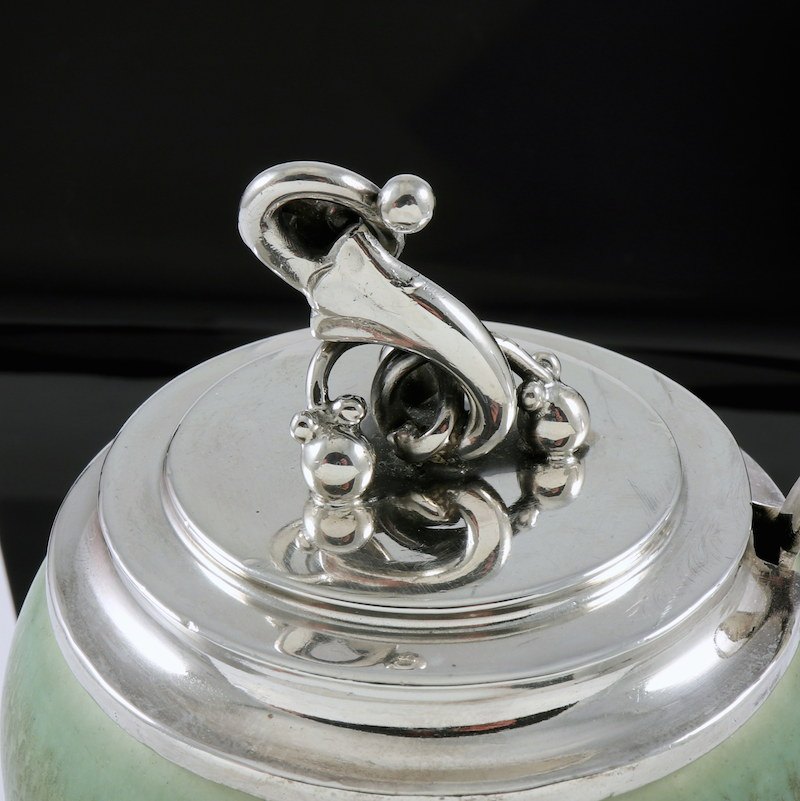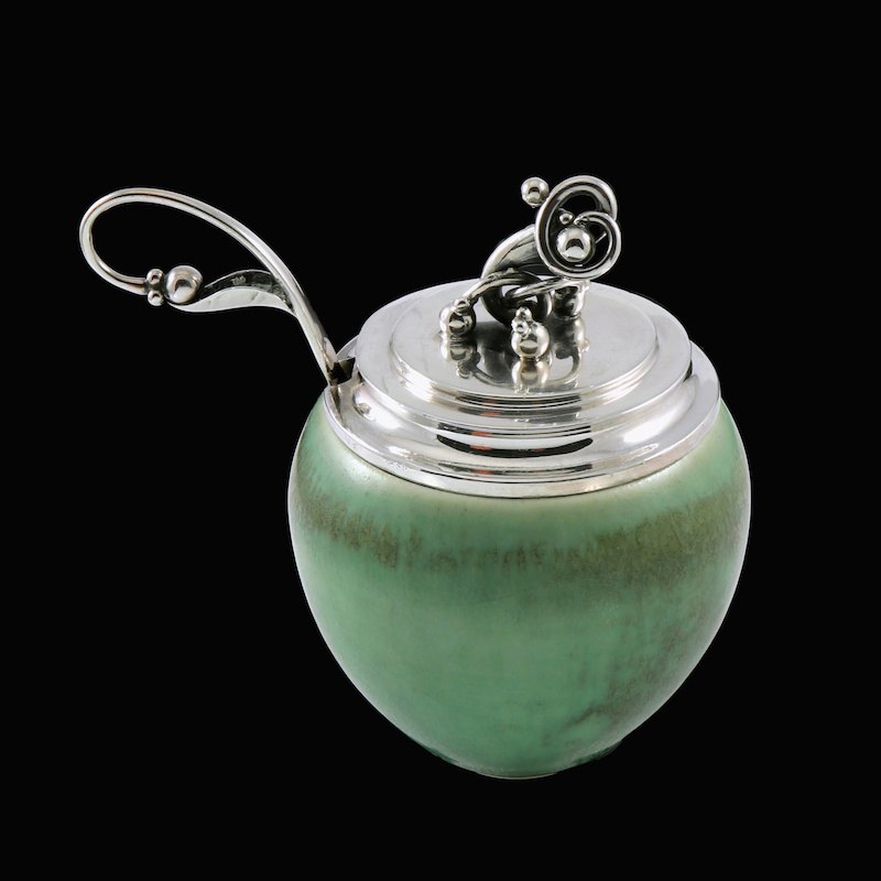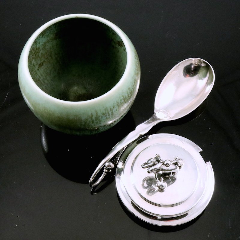 Saxbo - F. Hingelberg - Georg Jensen. Krukke i stentøj med låg og ske i Sterling Sølv.