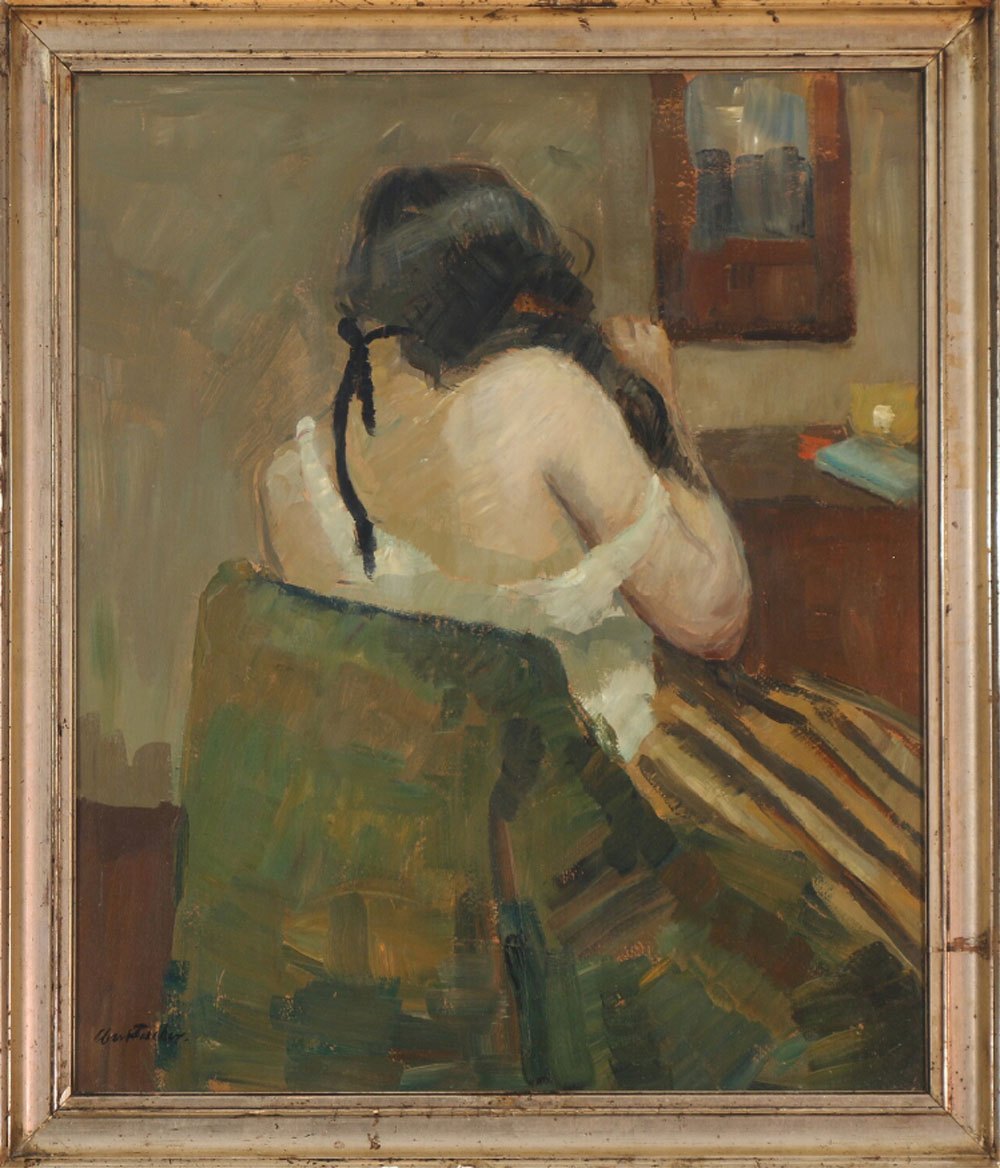 "Kvinde ved spejl" Oliemaleri i flot sølv ramme.